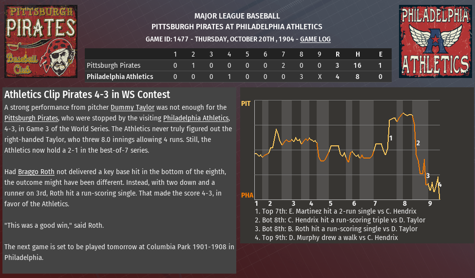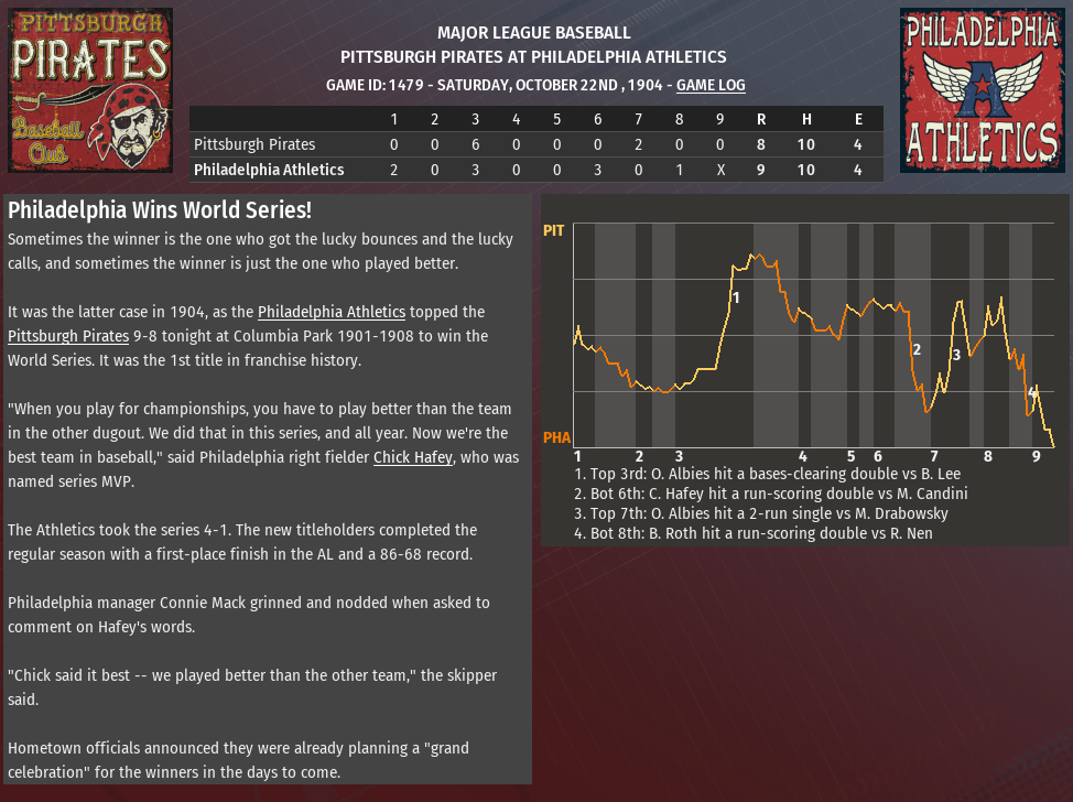Despite the tiebreaker drama, the Pirates come into this World Series as the favourites. They boast a star studded lineup that includes LF Paul Molitor (2x time All-Star, 1x time Sliver Slugger, 1x time Golden Glove), 3B Edgar Martinez (1x time All-Star, 1x time Sliver Slugger), 1B Adam Dunn (leads the league in walks), C Dale Murphy (3x time All-Star, 2x time Sliver Slugger), and 2B Ozzie Albies (3x time All-Star, 1x time Sliver Slugger). But the true firepower lies within their pitching. The names to know are Jim Devlin (1903's Pitcher of the Year), Milo Candini, and Dummy Tayor. Taylor has been a force of nature for the Pirates once he was given a starting role in June. His ERA never topped 2.00 as he accumulated a 14-6 record and 1.77 ERA, That ERA will go down in the record books as the best of all time, unfortunately that late start will likely count against him when it comes to Pitcher of the Year voting. The Phildelphia Athletics are anchored by their outfield. LF Fred Lynn (2x time Golden Glove), CF Braggo Roth (2x time All-Star, 1x time Sliver Slugger over his two seasons), and RF Chick Hafey (1x time All-Star and AL leader in sluggging). They are backed up by a solid pitching rotation. ![]() The Athletics have over-preformed against left handed pitching so they thought they had a chance against Jim Devlin but they simply had no answers against the reigning Pitcher of the Year. Their only success came in the top of the 9th, RF Chick Hafey hit a triple with a fly ball out to right field and then scored with a passed ball in the next at-bat. Unfortunately not enough of an impact as the Pirates take it out 3-1. ![]() The Philadelphia bats are unleashed to tie the series back up. The Pirates have their chances, they have ever so slightly more baserunners over the game but it's the Athletics that deliver behind a strong performance from Big Bill Lee on the mound. ![]() The Pirates once again fail to make use of their opportunities as the Athletics take advantage in the series. Dummy Taylor is pitching a gem when he starts the bottom of the 8th but Catcher Joe Astroth gets the ball rolling with a lead-off single on the first pitch and then the Pitcher Claude Hendrix smacks a triple to get a run home. Hendrix would then score on a wild pitch in the next at-bat. Pinch hitter Elmer Valo would then hit a line drive double, RF Chick Hafey bunts Valo over to third and then CF Braggo Roth hits a single to get Valo home and give the Athletics the lead. The Pirates were't done. They load the bases in the top of the 9th but ultimately get no one home and the Athletics get the advantage. ![]() The Athletics got nervous in the top of the 9th. They were sitting on a comfortable 5-1 lead but Philadelphia pitcher Ham Iburg started to show a lack of control. A single, hit by pitch, and a walk loaded the bases with only one out on the board. Another Hit by Pitch drove in a run and a LF Paul Molitor single drove in another. The pressure finally gave way a little when 3B Edgar Martinez grounded into a fielder's choice, it drove in another run but 1B Adam Dunn grounded out in the next at-bat to finish the game and put the Athletics one win away from the World Champion title. ![]() It's fitting that the combo of Philadelphia CF Braggo Roth and RF Chick Hafey is the duo that provide the winning run in the bottom of the 8th. The two of them have been at the heart of the Athletic's success this season. With one out on the board, Hafey hit a double, LF Fred Lynn will strike out to bring up Roth. He'd watch the first pitch go for a ball, have a swing and miss on the second, and then smack the third for another double to get Hafey -- and the lead -- home. It was a back-and-forth game. The Athletics got into the run scoring early with 2 runs in the bottom of the 1st but a massive 6-run inning from the Pirates in the 3rd changed the narrative of the game. The Athletics fought back in the bottom of the 3rd to trim the Pirates lead down to a single run. The lead bounced around until finally settling in Philadelphia's advantage. Willie McGill took the mound for the top of the 9th, he gave up a single to Ozzie Albies but then promptly struck out the next three out to seal it up.
