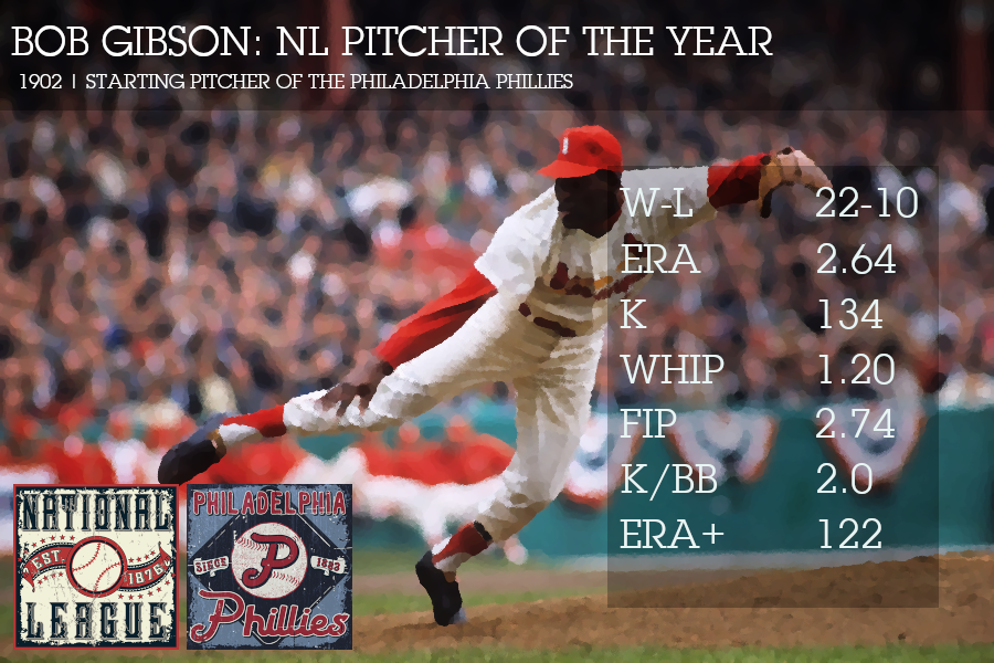 ![]() ![]() ![]() Unfortunately the MLB came around too late for Bob Gibson to show off his prodigious talents but it did give us a glimpse of what was possible with this 1902 Pitcher of the Year campaign where he showed the young guns how it was done in his age 34 season. See: 1902 Award Winners Bob Gibson started his career with the Philadelphia Athletics where he put up league average numbers and a losing record. 15-20 over his 35 starts with a 3.49 ERA for a 98 ERA+. However his 3.07 FIP suggested that his true talent was beyond that so when he was traded across town to the Philadelphia Phillies then the real Bob Gibson showed up as he went 22-10 with a 2.64 ERA, 1.20 WHIP and 123 ERA+ as well as leading the leagues in quality starts (27) and complete games (28) in his first season in Phillie colours. He was an near unanimous pick for the Pitcher of the Year award. Just a sole first place vote for Frank Harkinson of the Orphans ruined that. Age would catch up to Gibson next season. He started to lose a hair of control and his strikeout rates started to drop. A bit of lady luck helped to keep his numbers respectable but as the Phillies fell to 55-85 that season, 28 games out of the top spot, you could that see he was losing his drive. Gibson wanted to win and it seemed like his window to do so had opened and closed very suddenly. A 4-hit shutout of the St. Louis Cardinals in 1903 looked like he was back to his old self but those moments were the exception rather than the rule. Gibson wouldn't pitch at all in 1904. He stayed on the payroll but he wouldn't talk to the press to actually explain the situation. Rumours circulated that he had taken the 18 year old Bert Blyleven under his wing, impart all the knowledge he could on the Dutch kid.