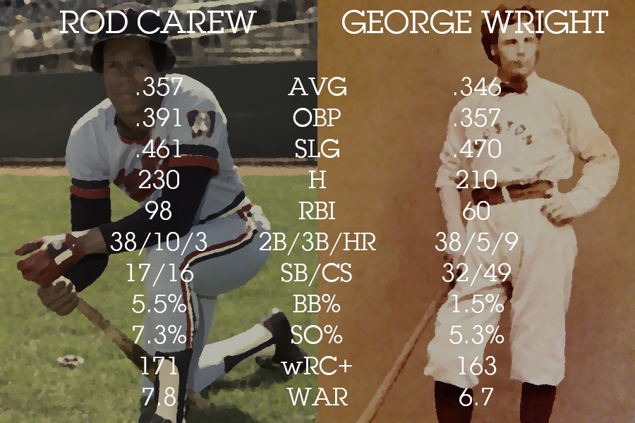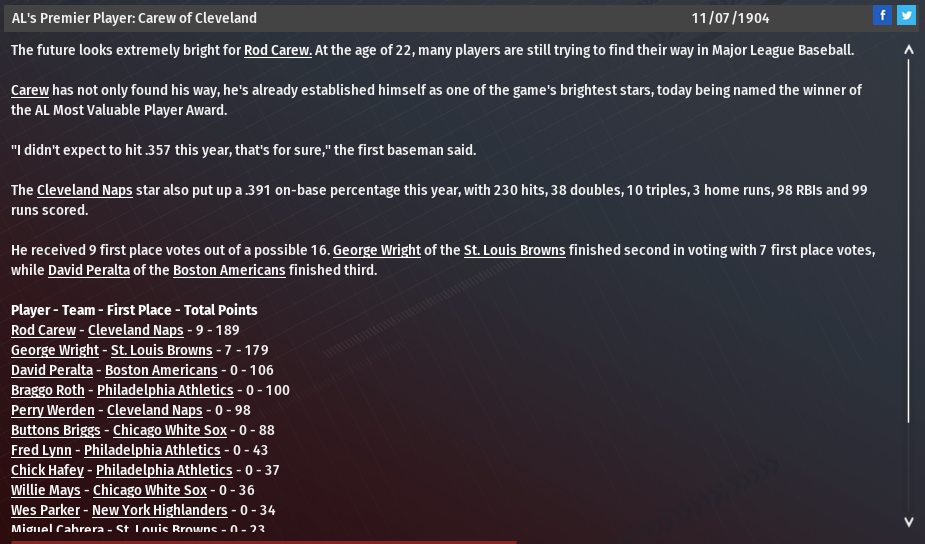 ![]() Year of the pitcher? No one told Rod Carew that. The 22 year old showed plenty of potential in his rookie year last season, picking up a Silver Slugger award at First Base but he truly unleashed the full Rod Carew experience this season as he lead the American League in runs, hits, doubles, RBIs, batting average, on-base percentage, OPS, WAR, total bases, wOBA, WPA, and wRC+. Just whatever stat you want to name really. He received some stiff competition from St. Louis SS George Wright who tied Carew for doubles while also leading the AL in home runs and throwing in some stolen base action in there as well. ![]() ![]() All in all, Carew received 9 first place votes and Wright got 7. But I'm not convinced on why it had to be so close based on the graphic above. ![]() This time we've got an unanimous pick in the National League. We might have been speaking his name last season had it not been for a fractured thumb that took him out of action for 7 weeks as he was putting up numbers to match that season's MVP Pete Reiser. With a full bill of health this season, he lives up to promise on a somewhat disappointing Reds team. ![]() Button Briggs took his game to a whole new level this season as he secured himself the first ever pitching triple crown as he led the American League in wins, ERA, and strikeouts (with his 287 strikeouts a new all time season record). Each season, Briggs has upped his K/9, from 4.4 to 1901, 4.6 in 1902, 6.1 in 1903, and 7.1 this season. At the same time, he's trimmed his BB/9 down from 3.7 to 2.4 since that 1901 season. There have been 47 games where a pitcher recording 10 strikeouts in the game. Button Briggs alone accounts for 9 for those. A simple unanimous pick. ![]() ![]() When 1902 AL Pitcher of the Year Charles Bender says you're the real deal before you make your debut then you stand up and listen. Bert Blyleven at 18 years old entered the league and dominated with a sub 2.00 ERA and 1.01 WHIP. His curveball proved devastating. A pity that the Phillies haven't surrounded Blyleven with some talent to get this guy to the world series. Last season's Pitcher of the Year, Jim Devlin of the Pittsburgh Pirates also picked up some first place votes. AMERICAN LEAGUE SILVER SLUGGER AWARD P Perry Werdern (Cleveland Naps) * C Jim O'Rourke (New York Highlanders) ** 1B Rod Carew (Cleveland Naps) * 2B Buddy Meyer (Cleveland Naps) *** 3B Braggo Roth (Philadelphia Athletics) * SS George Wright (St. Louis Browns) * LF David Peralta (Boston Americans) ** CF Willie Mays (Chicago White Sox) ** RF Chick Hafey (Philadelphia Athletics) NATIONAL LEAGUE SILVER SLUGGER AWARD P Dave Foutz (Chicago Cubs) * C Charlie Moore (Philadelphia Phillies) 1B Jeff Bagwell (Brooklyn Superbas) ** 2B Hardy Richarson (Chicago Cubs) * 3B Jose Ramirez (Boston Beaneaters) SS Denis Menke (Chicago Cubs) LF Johnny Hopp (Cincinatti Reds) CF Pete Reiser (Brooklyn Superbas) * RF Phil Cavarretta (Cincinnati Reds) * AMERICAN LEAGUE GOLDEN GLOVE AWARD P Ed Daily (Chicago White Sox) C Jim O'Rourke (New York Highlanders) 1B Wes Parker (New York Highlanders) * 2B Paul DeJong (St. Louis Browns) *** 3B Willie Kamm (St. Louis Browns) *** SS Ollie Beard (Chicago White Sox) * LF David Peralta (Boston Americans) CF Willie Mays (Chicago White Sox) RF Aaron Rowand (Boston Americans) ** NATIONAL LEAGUE GOLDEN GLOVE AWARD P Frank Harkinson (Chicago Cubs) C Kenji Johjima (Boston Beaneaters) * 1B Maikel Franco (St. Louis Cardinals) * 2B Dale Sveum (St. Louis Cardinals) * 3B George Kell (Brooklyn Superbas) SS Kevin Elster (St. Louis Cardinals) LF Roy Sievers (Chicago Cubs) * CF Whitey Lockman (St. Louis Cardinals) RF Phil Cavarretta (Cincinnati Reds) AMERICAN LEAGUE TEAM MVPS Boston Americans SP Mike Garcia Chicago White Sox SP Buttons Briggs ** Cleveland Naps 1B Rod Carew Detroit Tigers SP Lefty Williams New York Highlanders SP Jim Perry St. Louis Browns SP Al Maul Philadelphia Athletics SP Willie McGill Washington Senators SP Jack Powell NATIONAL LEAGUE TEAM MVPS Boston Beaneaters SP Jim Maloney * Brooklyn Superbas SP Teddy Higuera Chicago Cubs SP Randy Johnson * Cincinnati Reds SP Harvey Haddix New York Giants SP Eddie Lopat Philadelphia Phillies SP Bert Blyleven Pittsburgh Pirates SP Jim Devlin ** St. Louis Cardinals SP Ed Halicki **