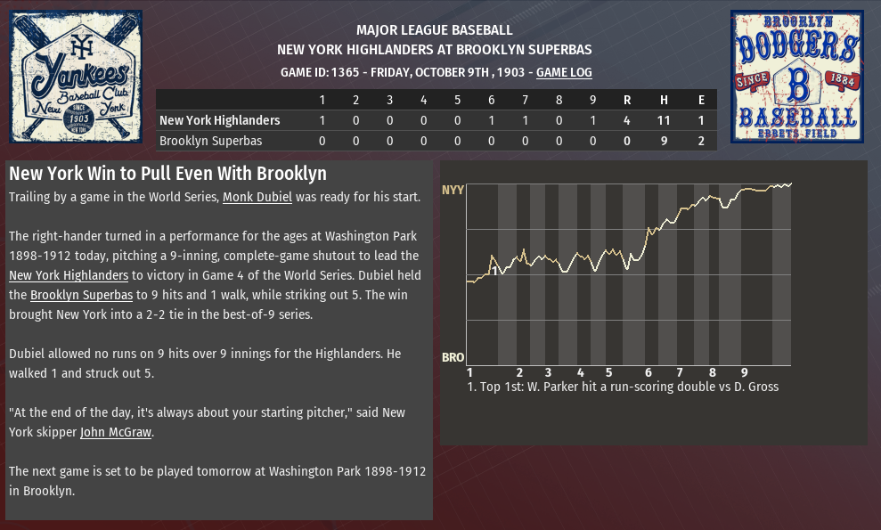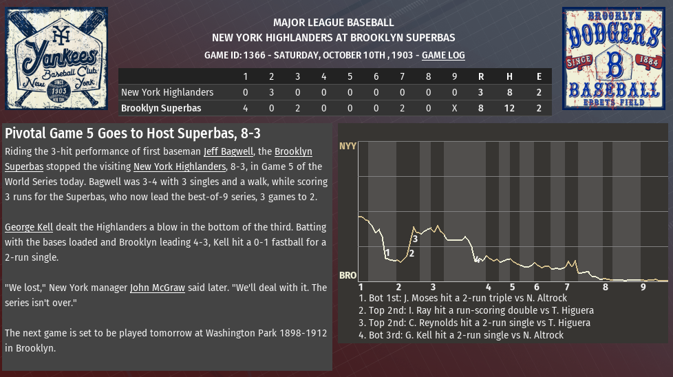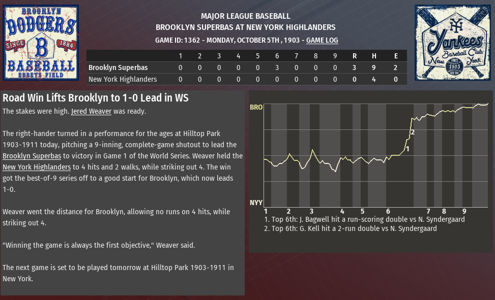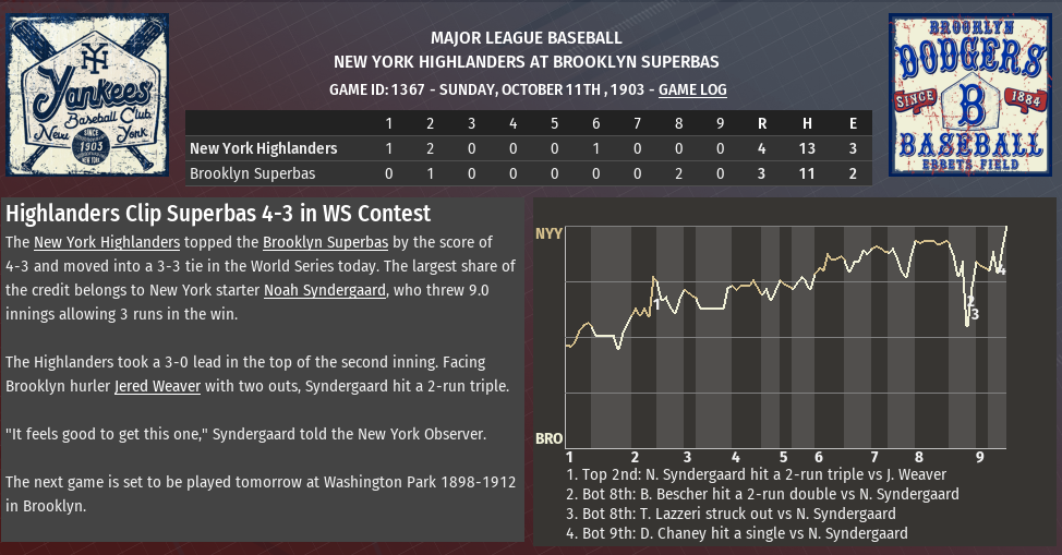 The Highlanders might be the new kids in the New York market but they are anchored by some old(ish) hands: in particular 31 year old 1B Wes Parker, 37 year old 3B Pete Rose, 29 year old 2B Irv Ray, and 30 year old LHSP NIck Altrock. Not that they are lacking any youth: Altrock is backed up in the starting rotation by 22 year old RHSP Noah Syndergaard and 21 year old LHSP CC Sabathia. The Brooklyn Superbas are full of young talent. 20 year old Rookie LF Pete Reiser has been a sensation to lead the league in batting average, slugging, doubles, and RBIs. He is backed up by 23 year old 1B Jeff Bagwell who complements Reiser's talent by leading the league in walks and OBP while also offering plenty of damage when his bat does make contact with the ball. The theme of youth continues with the pitching rotation. The oldest pitcher they've got is 26 year old Teddy Higuera and Ed Morris. Their ace is 23 year old Jered Weaver who confounds opposing hitters with his 6 pitch arsenal. For some reason, it's a best of nine this season! ![]() It was a battle of the rookie pitching studs in game one as Jered Weaver took on Noah Sydnergaard. Both pitched well with the only blip being the top of the 5th where a SS Paul Radford Single, LF Pete Reiser Walk, 1B Jeff Bagwell Double, and 3B George Kell Double gets 3 runs on the board. The only runs anyone would score in the game as the Superbas draw first blood in the series. ![]() Brooklyn's Teddy Higuera and New York's Nick Altrock are the next to take the mound and both deliver good performances as they keep the game scoreless in the first five innings before the game got tied up 2-all going into the bottom of the 9th. Teddy Higuera got into a jam early in the 9th when C Ray Schalk and 3B Jim O'Rourke got two quick singles and then a sac bunt attempt by 2B Rob Andrews worked out better than hoped when Andrews got on safely with no one else out to load the bases. SS Tony Graffanino came in but grounded into a fielders choice at home to keep the game running but also keep the bases loaded. Now Nick Altrock is not a good hitter, he's gone .146/.168/.155 this season for a -8 wRC+ but none of that mattered when he came up to hit as he smashed a groundball that threaded the small gap between the Third Baseman and Shortstop to get Jim O'Rourke home and secure the walk-off. A well deserved win for Altrock. ![]() After a pair of pitching duels, the bats started to unleash in game three. The Superbas thought they had the game in hand as they went into the bottom of the 9th, up 7-4, but the Highlanders had different ideas. The Superbas put Les Lancaster on the mound to finish the game -- someone who didn't even pitch in the regular season -- and they got punished for it. Two singles by 1B Wes Parker and LF Starling Marte followed by 3B Pete Rose reaching on an error saw the Highlanders load the bases with no outs. C Jim O'Rourke flied out harmlessly, but pinch hitter Skip Schumaker smacked a double out to the Right Field to clear the bases and tie the game up. Schumaker tried to stretch his double into a triple but he was thrown out at third. Nevertheless, job done. He had kept the Highlanders alive and forced extra innings. The 10th started off well for the Highlanders as 3B George Kell flied out but it started to full apart when they walked 2B Tony Lazzrei. LF Bob Bescher then hit a triple to get him home. This was followed by an intentional walk, error, error, bases loaded walk, double, fly out (phew), and a single to get six runs on the board as the inning flipped over. The Superbas handed the ball to Jered Weaver to pitch the 10th and he got the next three outs quickly for the Superbas to win the game and regain their advantage in the series. Les Lancaster is awarded the win in his first ever MLB game. ![]() The Brooklyn bats might have been hot in game three but they were dead in game four as Monk Dubiel pitched a complete game shutout. The Superbas only managed to get a runner in scoring position once throughout the game and that was on the penultimate out and only thanks to an error from the Third Baseman. Dubiel contributed on the other side of the plate as he picked up two hits while his side got 4 runs to secure the victory and tie the series back up again. ![]() The series continues to go tit-for-tat in game five as the Superbas lay a big win on the Highlanders. ![]() New York's Noah Syndergaard not only pitches a complete game but a two run triple in the second proves a key difference as his side comes out with a 4-3 win to tie the series back up again. Syndegaard absolutely shuts down the big bats of Brooklyn. Pete Resier went 0-5 while Jeff Bagwell goes 0-3 (with a walk and HBP to get him on base). ![]() It's a best-of-nine this season so this isn't the deciding game. Neither CC Sabathia (New York) or Ed Morris (Brooklyn) don't give up hits easy in this game and the score remains tight until the bottom of the 7th when the Superbas pile on for 4 runs to get a 6-1 lead. They add some more insurance in the 8th to go 7-1 into the bottom of the 9th. Ed Morris looked shaky in the ninth, where a infield hit, hit by pitch, passed ball, and double saw the Highlanders get two runs onto the board but the Brooklyn lead stands and the Superbas are now a win away from winning the World Series! ![]() The Highlanders certainly had their chances to keep their season alive and force the game nine. Down by two in the bottom of the 9th they had 3B Pete Rose on third and 2B Julio Franco on second with SS Tony Graffanino in the batter's box -- down to their final out. Teddy Higuera was on the mound, 171 pitches deep and not messing around. Graffanino fouled the first off, took the second for a strike, and then fouled off the third. He takes a desperate swing at a slider out of the zone and grounds out in a 5-3 play to seal the deal for the Superbas.