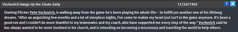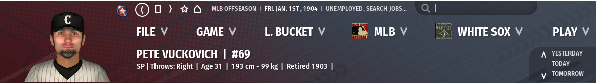 In what is probably the first notable retirement since the birth of the league. Pete Vuckovich surprises everyone by retiring at the age of 31. ![]() ![]() ![]() ![]() Vuckovich was a member of the Chicago White Sox over his three year career. An All-Star in 1901, with his selection probably helped by a pitcher of the month campaign in June 1901 where he pitched two complete game shutouts. Born in Johnstown, Pennsylvania October 27, 1872. Vuckovich was just 16 during the Great Flood of 1889 that killed 2200 of his fellow townspeople. Inspired by the work of the American Red Cross who supplied critical disaster relief, Pete dedicated himself to humanitarian efforts for the years that followed. Baseball was a hobby until it became Vuckovich's job when the sport went professional in 1901. While the money was good, clearly it left a hole in his soul. He was an imposing figure on the mound, standing 6'4" and weighing 218 pounds, his best pitch was the slider which helped him get through 8 complete game shutouts throughout his career. Good enough to leave him tied for 6th all time and only 2 off the all-time leader -- and tied for the most shutouts by a member of the Chicago White Sox. His 4 shutouts in 1901 currently stands as a White Sox record. He was a member of the White Sox team that played in the 1902 World Series against the Chicago Orphans. The White Sox would go down 4-2 in that series with Vuckovich going 0-2 in his starts with a 4.60 ERA. To compound on that, Vuckovich will go down as the White Sox member with the most pitching losses in the short history of the club.