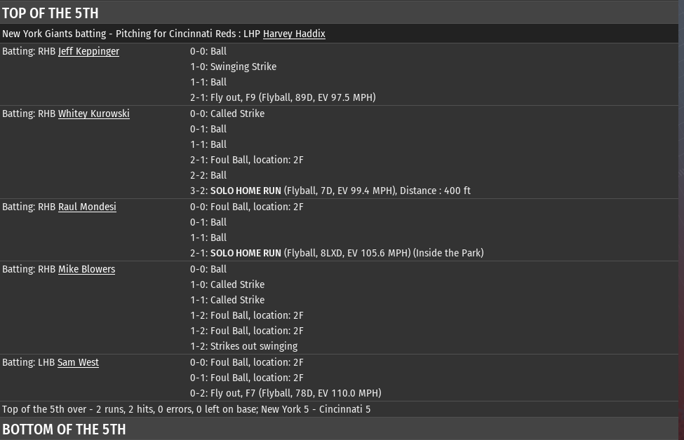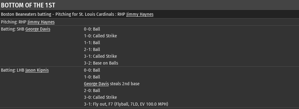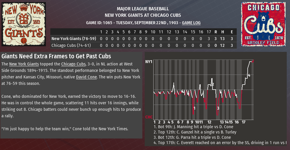 Some notable games of the season. ![]() Chicago 1B Mark Teixeira did all he could to win this game against the Boston Americans. He went 4-4 with a walk with his final hit of the game being a 3-run home run to get his team a 6-4 lead going into the bottom of the 9th. But alas, the Americans loaded the bases with no outs and a subsequent error from Gold Glove Right Fielder Dick Williams let the Americans tie it up. All that was left to do was for the pitcher Bobby Jones to get a walk-off sac fly. ![]() The Phillies might have look dead and buried in this game but an single from Philadelphia RF Ben Chapman and fielding error from Pittsburgh LF Bob Bescher let them walk it off. ![]() Giants LF Raul Mondesi was involved in two key moments in this game. The first, back to back home runs in the top of the 5th from 3B Whitey Kurowski and Mondesi which would tie the game up at 5-all. ![]() And then with the Reds up by two runs going into the top of the 9th, Mondesi is the batter involved. A hard hit line drive to the outfield should have been an out but a bad route from Reds CF Paul Hines sees them let two runs to tie the game up. The Giants would get another run for the lead and the Reds will go with a whimper when the inning turns around. ![]() Beaneater 2B Harry Reynolds had an absolute field day this game against the Giants. Stealing a total of 5 bases just to add insult to injury in his side's 8-0 victory. ![]() ![]() The pitcher that defined this achievement is not alive yet in this reality for it to be named after him but Cleveland Pitcher Mike Garcia not only managed to get two Madduxes in a season (complete game shutout in 99 pitches or less) but he did it in successive starts. ![]() Iron Man performance of the year went to Chicago White Sox Jack Taylor who went all 15 innings in his side's 3-2 win over the St. Louis Browns. Fun story though, exact same day. The Detroit Tigers need 15 innings to get past the Cleveland Bronchos. The score? 3-2. Some Retirements Not that they did much in this reality but some notable retirements: Craig Biggio, Tommy Cocoran, George Burns, and Paul Derringer. Changes! The Baltimore Orioles pack up shop and pop up in New York as the Highlanders. The Cleveland Bronchos also change their name to the Cleveland Naps. Draft Picks Some names to watch for. Cardinals got RF Hugh Duffy with the first pick, Tigers got 1B Pedro Guerrero, the Naps got 2B Rod Carew, and the Highlanders pick up SP Noah Syndergaard.