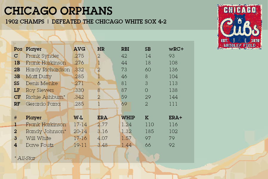 After good but not great seasons in 1901 both Chicago teams made commitments to their fans that they were in it to win. By the end of May, they were making good on their promise as the pair sat on top of their respective leagues. The White Sox, with a 23-12 record were just holding off the 21-14 Boston Americans, last placed in 1901 but fueled by outstanding seasons from LF David Peralta and SP Charles Bender. The Orphans held a much more commanding hold on their division with a 28-13 record. 5 games clear of the 23-18 Pittsburgh Pirates. The Orphans started to fall off the pace over June, their lead had slipped to just one game over last season's World Champ Phillies. A lineup that had largely stayed intact from last season, with the exception of the acquisition of Bob Gibson who was firing on all cylinders at the top of the rotation. Fearing they were losing control of the season, the Orphans went all in and traded away four young guys to the bottom of the table St. Louis Cardinals for the services of 2B Hardy Richardson to provide a spark to their offense. Richardson was a .316/.371/.383 hitter for the Cardinals with 31 stolen bases,121 wRC+, and average defense. He improved those numbers for the Orphans: going .346/.410/.425 for a 149 wRC+ with 29 stolen bases over his 73 games with the Orphans. He provided a nice boost to go along with the excellent offense of CF Richie Ashburn and LF Roy Sievers. Despite that, the Phillies were on a tear. A 16-9 June and 13-8 July put them three games up on the Orphans by the end of July. Over in the American League, the Chicago White Sox held steady. The Boston Americans would threaten the White Sox, even overtaking at one point but a 11-18 slide over September would kill their chances off. The Baltimore Orioles hit their stride in the last stages of the season with a 20-9 record but it was a little too late for any hopes of securing the pennant. The Orioles would have to settle for second. Over in the National League, the Phillies felt their season full apart over August, when they went 10-15 and gave the Orphans the chance to regain their hold on the National League. Finally, on the 23rd of September, the Phillies get shutout by the Beaneaters and the Orphans get a big 9-3 win over the Reds. The Orphans will never give up the lead on the National League again and a strong finish saw them take the pennant with a 6 game lead. The stage was set for an All Chicago World Series. ![]()