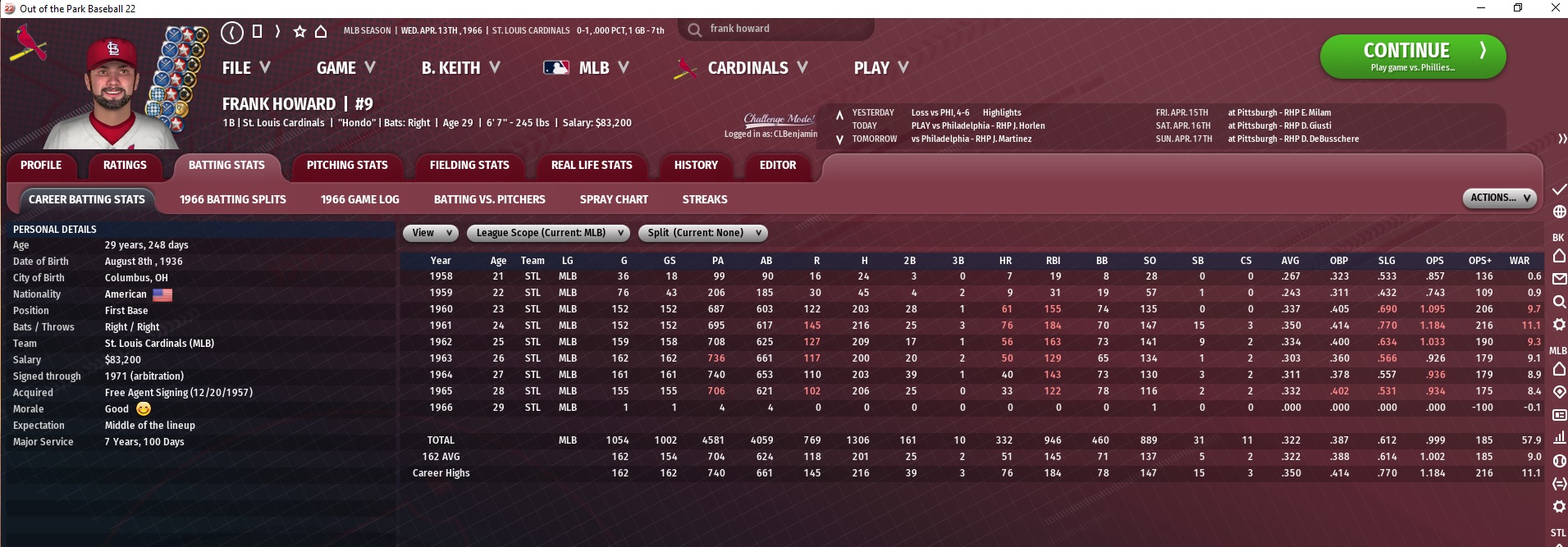 Hondo came back in '61 and blew past 61 (or 63) hitting 76 with 184 RBIs. He's 29 and 20th on the HR career leader list. His career .999 OPS is 8th all-time. |