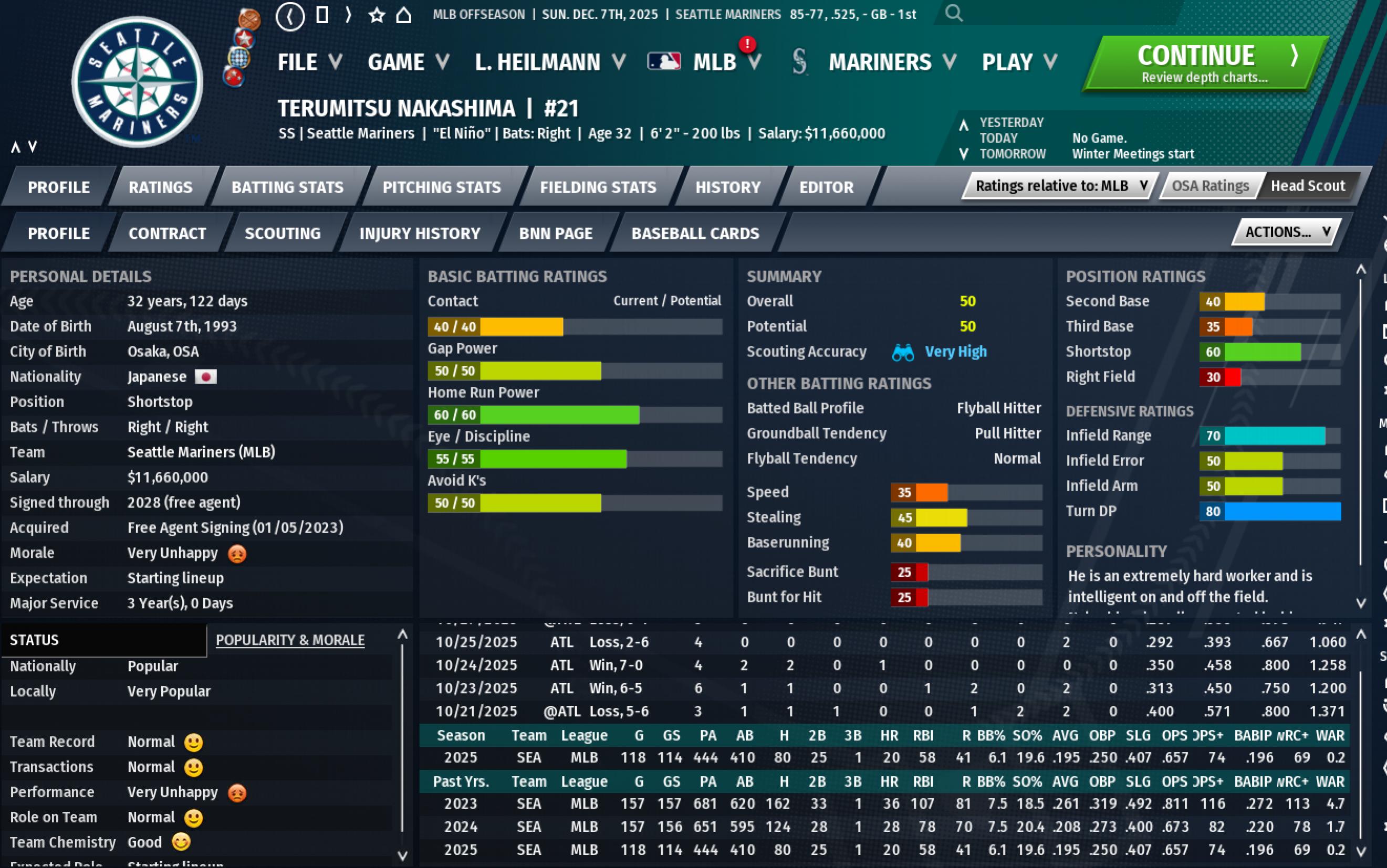 In the past, I've faced guys who had a season with a low BABIP, but never this bad. In my Mariners save in the 2025 season, I had a 32 year old shortstop whose BABIP was at .196 over 444 plate appearances which led to a triple slash of .195/.250/.407 slugging for a 74 OPS+ but still 45 XBH (25 doubles, 20 home runs). He has had declining contact rating (40 vs righties, 45 vs left) and his a flyball and pull hitter, but still with decent power numbers and defense. He had a low babip already the year before (.220) but it was due to a long cold spell in the second half of the season.