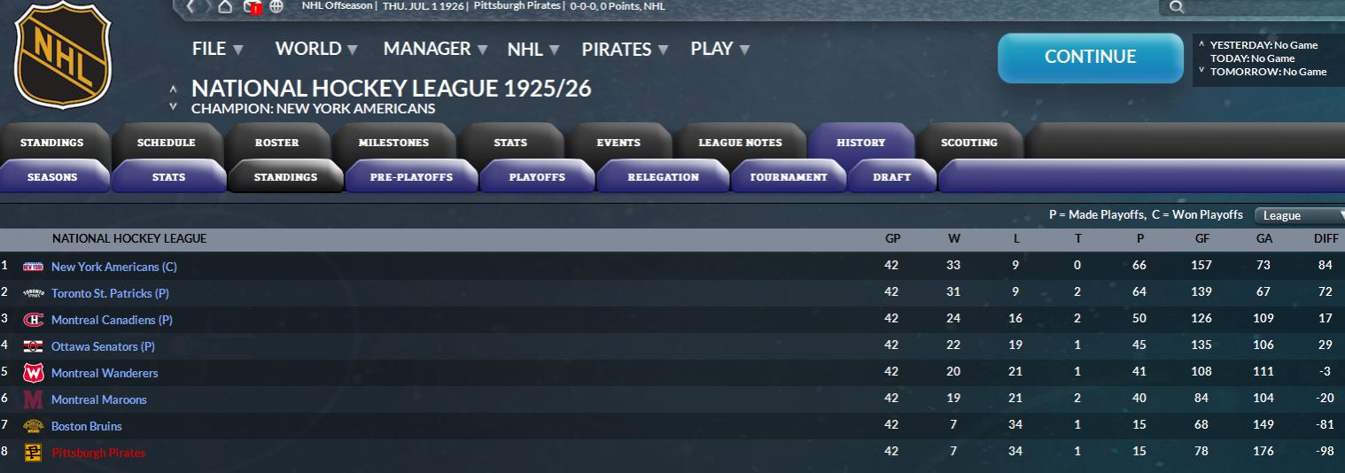 in 1925-26 season. They had an identical record to Boston, so I'm guessing that the tiebreaker is goal differential? Anyway , the 1926 NHL draft order then shows Boston drafting ahead of Pittsburgh. They haven't exchanged picks. The only other relevant change is that I removed the Montreal Wanderers from the league on 1st July 1926. |