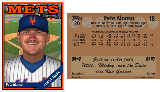 I tried to make a generic version of this set, which would work for any team's nickname. However, the font just looks terrible when I try to get it big enough to match the card style (esp. since OOTP font choices are so limited). And since the Bookman font seems to be what Topps used for the team name, I opted instead to make dedicated cards for each team. So that does mean that these files are not generic and cannot be used for any team nickname; they can only be used for existing MLB teams. All teams today are represented, along with the Expos. There are also files for the Devil Rays, Indians, and Senators, and an Oakland version that says "A's" and not "Athletics" on the front. In addition, for Philly, Seattle, and Miami there are alternate cards with different team colors. There is an All-Star design that is based on Topps' actual 1988 all-star card, and I also made my own All-Star design. And I decided to have some fun on the cardbacks with a series of baseball haiku. ![]() Place the xml files in your bbcards templates directory (for OOTP23, it's Out of the Park Developments\OOTP Baseball 23\bb_cards\templates\ootp23), and place the images file into your bbcards images directory (for OOTP23, it's Out of the Park Developments\OOTP Baseball 23\bb_cards\templates\ootp23\images). All of the templates have a line in them that uses my team backgrounds file (which can be found here: https://forums.ootpdevelopments.com/...d.php?t=328973). If you want to take the team backgrounds out, edit the xml file by taking out the token with [%TEAM_NICK]_[%RANDOM_NUMBER].png. |