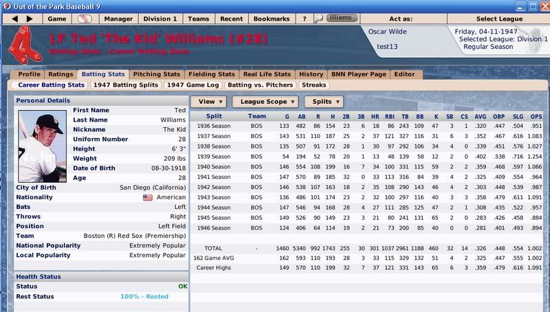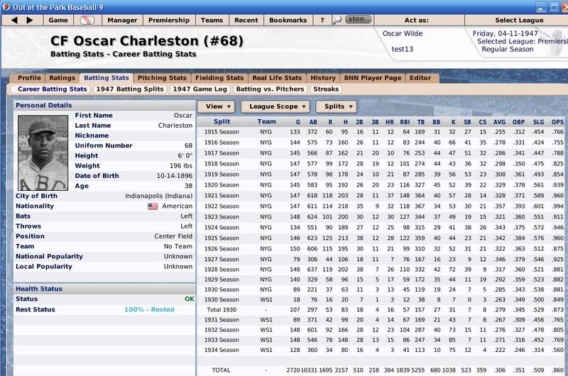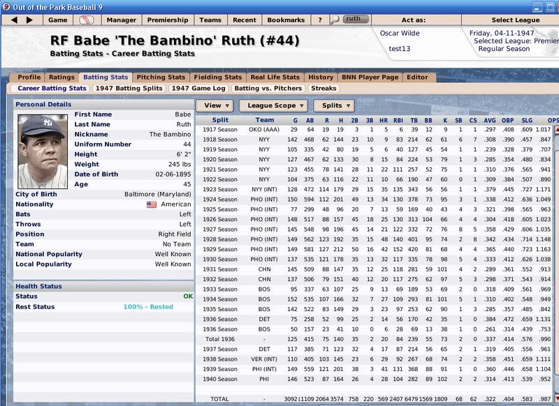 As far as the Championship decided during the season, I stated that with reference to the 154 game season & no playoff structure. Each of the 3 leagues has 16 teams, and each league has a 154 game schedule. The best record at the end of the season is crowned the champion. As far as the game stating that the postseason starts on 9-27 -- that's actually stated in error by the game. I have the Premier League set as a Major League Level league with no playoffs. When you do that and disable the playoffs, the game does not recognize it. I could have set the league as an INT league and the wild card would not have displayed and that playoff message would not be stated in error -- but then when viewing player's stats every team would have a (INT) after it and you would not be able to know what league they were in from year to year. But whenever a league is set to Major League Level, it will not recognize that there are no playoffs because no Major League Level leagues don't have playoffs. So even though there are wild-card standings, and there are messages about the playoffs -- there is no wild-card and there are no playoffs. The only time there is a playoff, is when after 154 games the top teams are tied. This results in a one-game playoff for the championship, or a round robin if there are multiple teams. From time to time the 2nd place teams will tie -- and this results in a one-game exhibition to break the tie even though it has no bearing on the championship. As far as that database message -- Before you proceed any futher, you must set a database path for the league to grab players from each year. The database that I recommend for use with the file is Spritze 5.0, which is also available for download on the same page as my file at All Sim Baseball under OOTP 9 Mods. To set your database path go to : Game/Game Setup/League Setup/Rules Under the heading Historical Rookie Options there will be a line which reads Database path: Download Spritze's database and place it somewhere for safe keeping on your harddrive. In the space provided enter in the path to that folder. For instance, if you just place that database into a folder called Spritze, and put it right onto your C: drive (look for further instructions on a future post), the database path is: C:\spritze If you were not going to download Spritze's database and didn't care about Negroe League players such as Satchel Paige or Oscar Charleston -- then you can just use the original database that came with the game. In that case your path would be something like this: C:\Documents and Settings\YOUR NAME\My Documents\Out of the Park Developments\OOTP Baseball 9\stats EDIT : Wild-card standings issue is fixed - they no longer display. EDIT: All 3 major leagues are major league level - INT no longer displays. Click on a player's BNN page in order to see their league history. Last edited by pbar25; 12-31-2008 at 02:07 AM. |