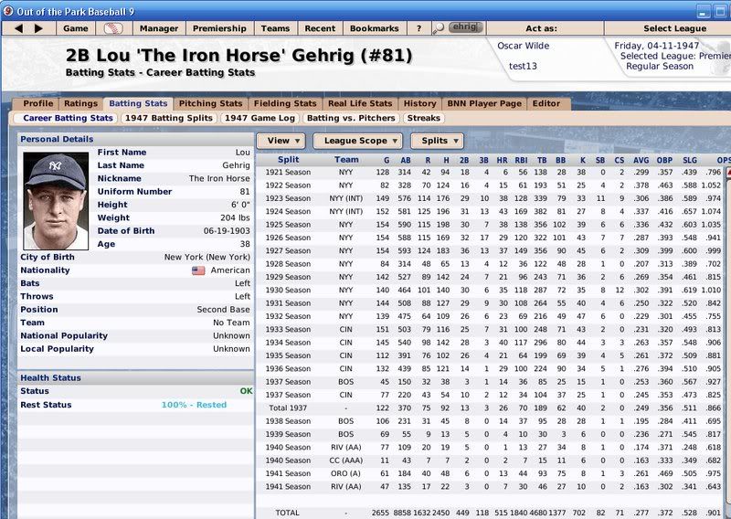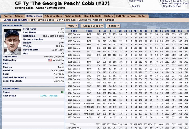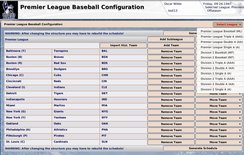 3 Leagues of 16 teams each Premier League Champion is the Champion of the World 16th place in the Premier League is relegated to Division 1 Division 1 Champion is promoted to the Premier League 16th place finish in Division 1 is relegated to Division 2 Division 2 Champion is promoted to Division 1 16th place finish in Division 2 is one bad franchise I have never been a fan of the current wild-card playoff system, division championships, or even league play. Putting the MLB into an English Premier League system creates so many new areas of focus throughout a baseball season. Below I will include some stats and results from my current testing of my file which currently sits at 4-11-47. This will give you some idea of the results you might have. As well, here are a few of the different story lines that come about from season to season within this Premier League setting along with the makeup of the initial file which starts in 1907. Premier League ![]() ![]() ![]() As you can see, Division 1 & Division 2 are set as 'International Leagues'. This allows you to quickly discern between Premier League stats & all other league stats (INT, AAA, AA, A). These two leagues are a set a notch below the Premier League in player talent. While the Premier League will bring in all historical real players, the international league creates a limited number of fictional 100% international players during a 3-round only amateur draft each season. To be the Premier League all-time HITS leader or HR leader is obviously quite the accomplishment. The goal of hitting 500 career home-runs is much loftier then in traditional league setups however. To play on a team and enjoy an entire career within the Premier League is an accomplishment all in itself, and few will do it. It's 1947 in my test file (pictures from that are following), and 500 HRs in the Premier League has still not been accomplished. I have been hands-off outside of changing Ruth's position in 1918. ![]() ![]() I picked 1907 in order to sim a full 100 seasons and see how it plays out. Helps that Cobb, Speaker, & Joe Jackson were all just entering the league. ![]() ![]() ![]() ![]() Ruth is the perfect example of what can happen to teams should they face the agonizing prospect of relegation. Thus far, the most devastating loss for a team in Premier League history occurred on the final day of the 1922 Premier League baseball season. The Yankees lost their final game of the season, and were relegated for the first time in franchise history -- and it could not have come at a worse time for them. The following season they finished 3.5 games out of the Division 1 Championship, and were forced to suffer one more season relegated until finally getting back with a Division 1 Championship and promotion in 1924. But the damage was done. After one full season with a lower media contract, fewer fans & merchandising, team changes were in order and Ruth was shipped off to the Phoenix Diamondbacks forever changing baseball history. (actually the Arizona Diamondbacks, but I prefer City names for teams) Cobb is a good example of how many former Premier League Superstars will finish their career with teams down in Division 1 & Division 2 with dreams to someday return. Charleston was one of the rare guys who started and finished within the Premier League, which in turn places him all over the all-time leader-boards. ![]() Only one team from Division 1 or Division 2 has won a Premier League Championship. The 1932 Montreal Expos, led by Fritz Ostermueller & Waite Hoyt (Hoyt being yet another Yankee casualty during their relegation period). Few promoted teams can actually remain for an extended period of time up within the Premier League. As time goes on, they must compete with the larger stadiums of established franchises, big contracts in their new environment, and if they are not a real baseball franchise of the period -- they can only build through free agency. Real teams get their historical actual players. ![]() ![]() The Red Sox suffered relegation in 1920. They finished in 2nd place twice down in Division 1 but could not get back up to the Premier League again until 1929. They barely staved off relegation the following two seasons, just in time to get a young Ted Williams who has saved the franchise and put them in line with the all-time great teams. In the initial file, I set the Hall of Fame credentials a little too high -- that is something you might want to change to your own tastes. I prefer that only a handful of players ever make it. Each season on roughly 9-26 each year, you must go into Game Setup, League Setup, Functions Tab, & Edit League Structure. Go in between the 3 leagues and promote champions, while relegating last place teams. Don't forget to regenerate the schedules!