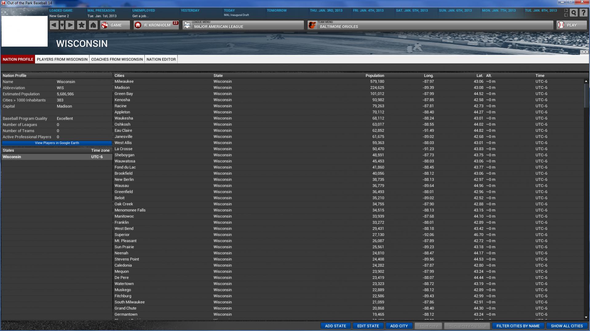 ![]() As for team locations, I am using the newly created States as Nations World_Default file that was created for this project: http://www.ootpdevelopments.com/boar...s-project.html All of my teams are in the US in the Central and Eastern Time Zones. Last edited by Bottom Of The Sixth; 01-22-2014 at 01:01 PM. |