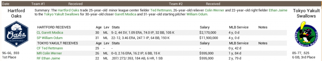 Right now, I'm assessing the farm system and shopping guys to see what I can get on the open market. I'm open to dealing prospects, because none of them are ready enough for us to use now. Remember in a stats only league, their stars (which I have activated for simplicity) don't really mean a whole lot once the guys make the bigs and get a bit of time under their belt. I can't even figure out what the game goes on in terms of developing prospects especially if they have a few bad years in the minors. My goal right now is to see if we can't get a few lotto picks who might be AAAA or good enough for the bigs but blocked in the D2D. If I can get a few of those guys over here, it'd be good. Also gonna head to the Indian league and see if there's anyone we can acquire. It'll cost us $7.5 million to buy a player's contract from over there, so he has to be worth it, but...at least it's an option. Made my first deal with the Oaks. A trade with a Japanese team in the UPB after putting one of my own AAA outfielders on the market. He was good enough to start, but I don't think we needed him and wanted to see what we could get. Trade difficulty is on hard, but when you have like 60+ major league teams, there's always a deal someplace. Which I like. ![]() In this deal, we take on some salary. Odum, 31, replaces the #2 starter we lost in the off-season to free agency -- and who is out of our price range -- but we also end up with one of the best closers in baseball hands down in this deal and he's a downright bargain. We gave up some youngsters but none were immediately in our plans. It just cost us a bit of financial flexibility, but we still have another $16 or so million to spend this off-season and I'm not done yet. Last edited by darkcloud4579; 12-25-2014 at 04:14 PM. |