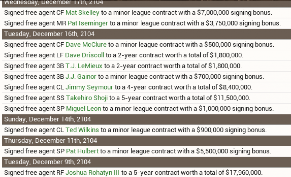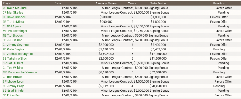 Anyway on the 3rd turn, it was mostly about trades rather than any free agency moves. We purchased two contracts from the Indian league including the reigning IPL pitcher of the year. Hilariously, he ended up in Indian because the previous regime of this franchise DEALT him there. Not sure what that was about, but when I ran across him, decided he was worth the bargain of paying for his repatriation plus the last year of his $12.5 million deal ($4.5 million) to shore up our rotation. We also paid to acquire prospect catcher Xavier Bove, who after three strong years in the IPL was never going to get to the bigs until his deal there ended. I think he has a lot of potential and at age 20, thought it was worth it to bring him over here to see if he could hang on a big league club even though we have a solid catcher to begin with. Lastly, we made a deal of our own minor league catchers to Indianapolis who had a surplus at relievers for their closer, which solves our bullpen issues even more. A solid move. We're not done yet heading into our last turn. Will be curious to see if we land -- and who we land -- from free agency, I didn't increase any of our offers. If we stopped now, I'd be fine with taking this club into the season, knowing we'd have some moves to make during the regular season depending on how things were going. I have at least one prospect who needs to be dealt, too. ![]() ![]()