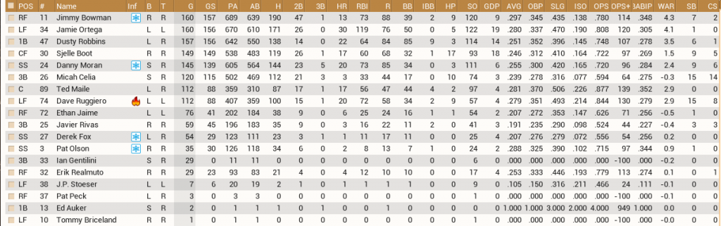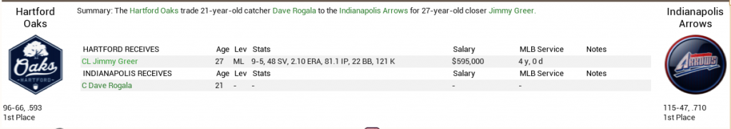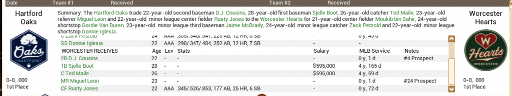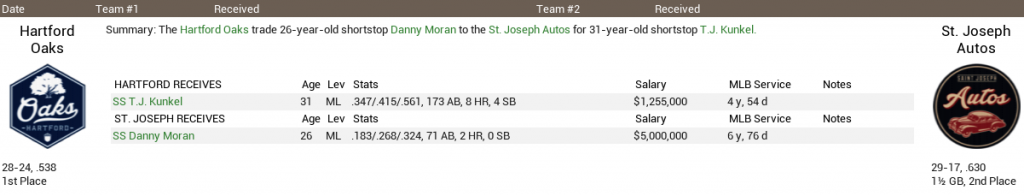 I'm about to make my final move of this regular season, in a deal that'll actually shed some cap space. Underachieving but versatile SS Danny Moran is going to St. Joseph of the UPB in exchange for their starting SS T.J. Kunkel. On the surface, the deal doesn't even look to make sense but Moran is five years younger and has had better years than Kunkel has and he can play four different positions, which explains the demand for him.