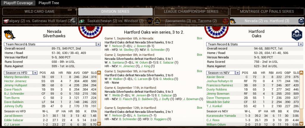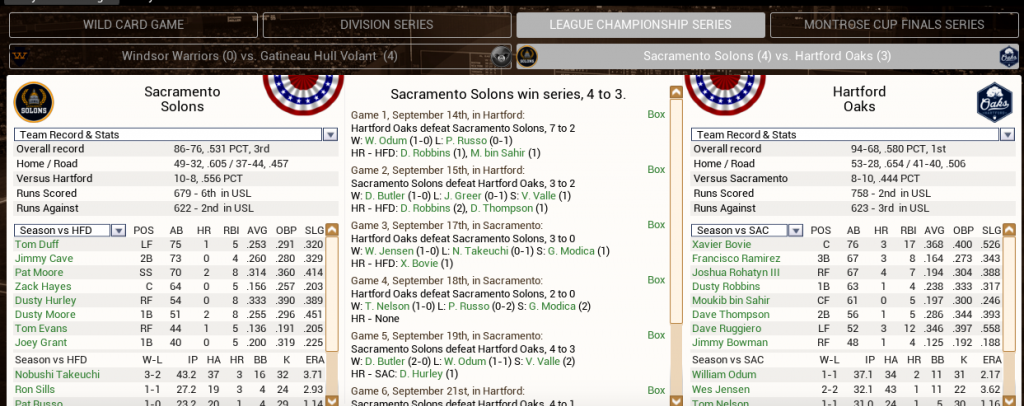 ![]() Our season ends in a heartbreaker against the Sacramento Solons who advance to the Montrose Cup Finals and end our year in the LCS. Truthfully, this team could've fallen on its face a lot sooner. I made some relatively dramatic moves to the core of the team, some of the moves paid off, while others I'm skeptical about. But all of them were generally made in the direction of thinking long range and so, I think we're well positioned to make more moves to get the team back here next year and this time, over the hump. I always thought this team, from the start of the year, was missing something and I wasn't really sure what to do about that because I inherited this team rather than built it, so was always sorta hamstrung from the start. Soo....that's where we are right now. For next year, need to make more tactical moves in an effort to get back here. We'll have payroll go down by about $20 million which should help, coupled with some of the other moves we've made, there are guys we can deal too. I'd say it was a disappointing year, but the building blocks are in place for us to be looking forward to the future. |