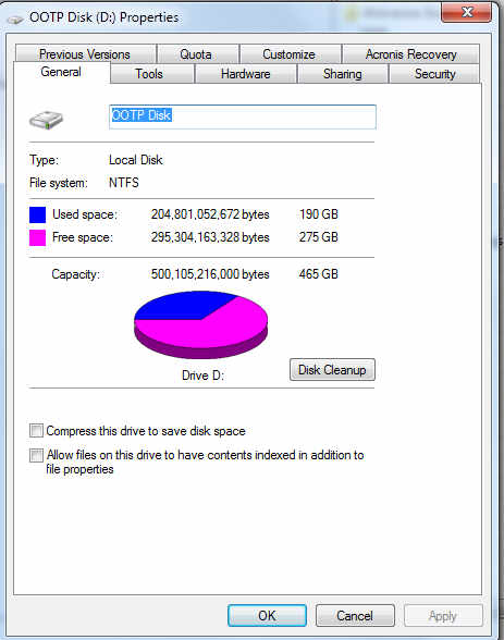 Do you have more than one drive letter ie C:\ and D:\ on it. Right click on C:\. Choose properties and you should see something like the screenshot below. Compare free space with what the OOTP installer is telling you. An external HDD is something you plug into a usb port so you can copy stuff to it. If you have little space left on your computer it might be prudent to go to Best Buy and buy an external HDD. They are very low cost these days. As your computer HDD fills up performance will suffer.