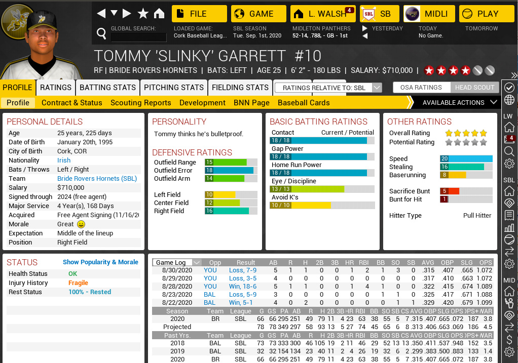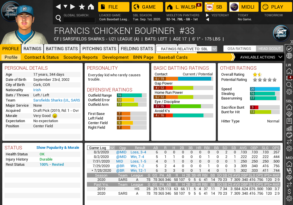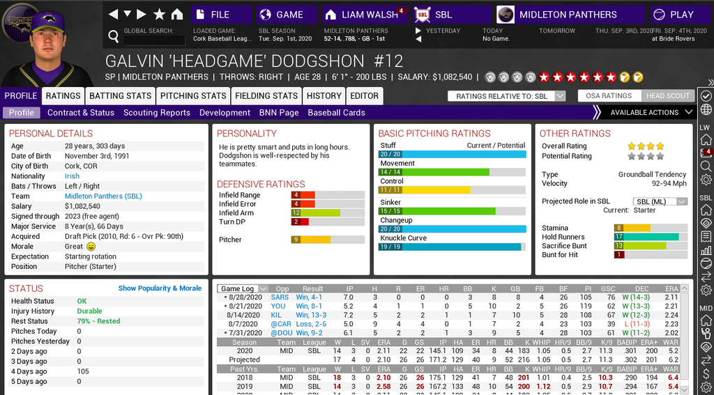 ![]() ![]() Prospects: ![]() ![]() Galvin Dodgshon is my star pitcher that has been the top pitcher for 4/5 years in row I think. Has won three pitching triple crowns and pretty much destroys everyone when it comes to strikeouts (until this year, my new pitcher is close behind and a reliever convert is going to break his record) I like having only 16 teams in the league because I really get to know the players. The top 20 are filled with "household names" on both sides.
