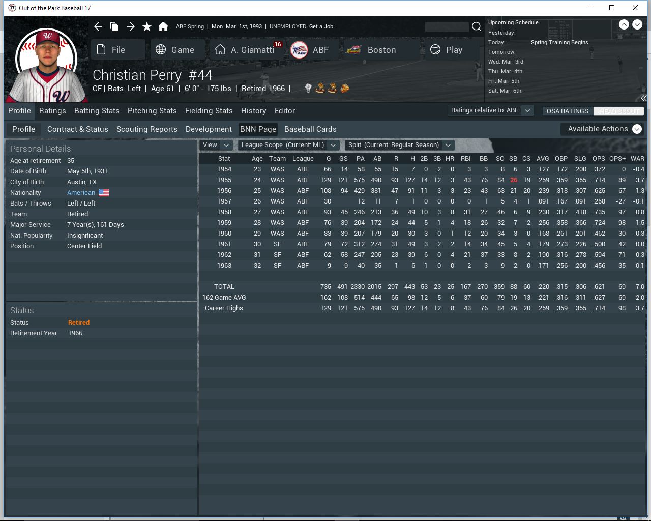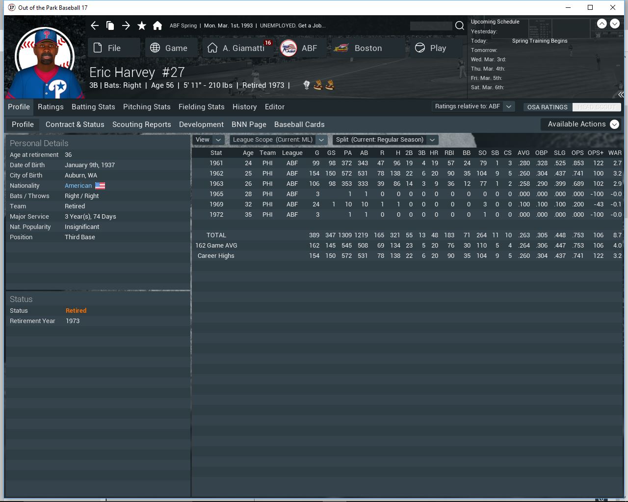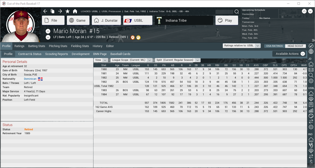 Here's a couple of the worst flameouts so far in my league: MARIO MORAN was the league's top rookie in the USBL's inaugural 1980 season. He put up .288/34/106 numbers, and with 30 steals, had an impressive 30/30 campaign. Moran even won a Great Glove award! He slumped to .227/9/31 with a mere 3 steals in his sophomore year, however. An early-season 1982 trade to Boston did him little good. He returned to New Mexico in 1984, but never played in the majors again after that. After languishing in the minors for a few more years, he retired after the 1989 season. ![]() STEVE BREWER won the ROY in 1988 with an outstanding season as the closer for the Chicago Wind Sox. He set a USBL record for saves in a season with 59, which still stands. Only all time great, 400-plus save closers Julian Perez and Cesar Farias have come close to that mark. Unfortunately, so far, those are the only 59 saves Brewer has. After flaming out in Chicago and Iowa, he's now back with the Sox, hoping to recapture past glories. Barring a free agent signing, the team has no true closer, so perhaps Steve can still get his old job back. His stats the last few years don't look good, though. ![]() Anybody else have guys fall off the face of the Earth after winning the ROY? Last edited by ThatSeventiesGuy; 05-26-2016 at 02:23 AM. |