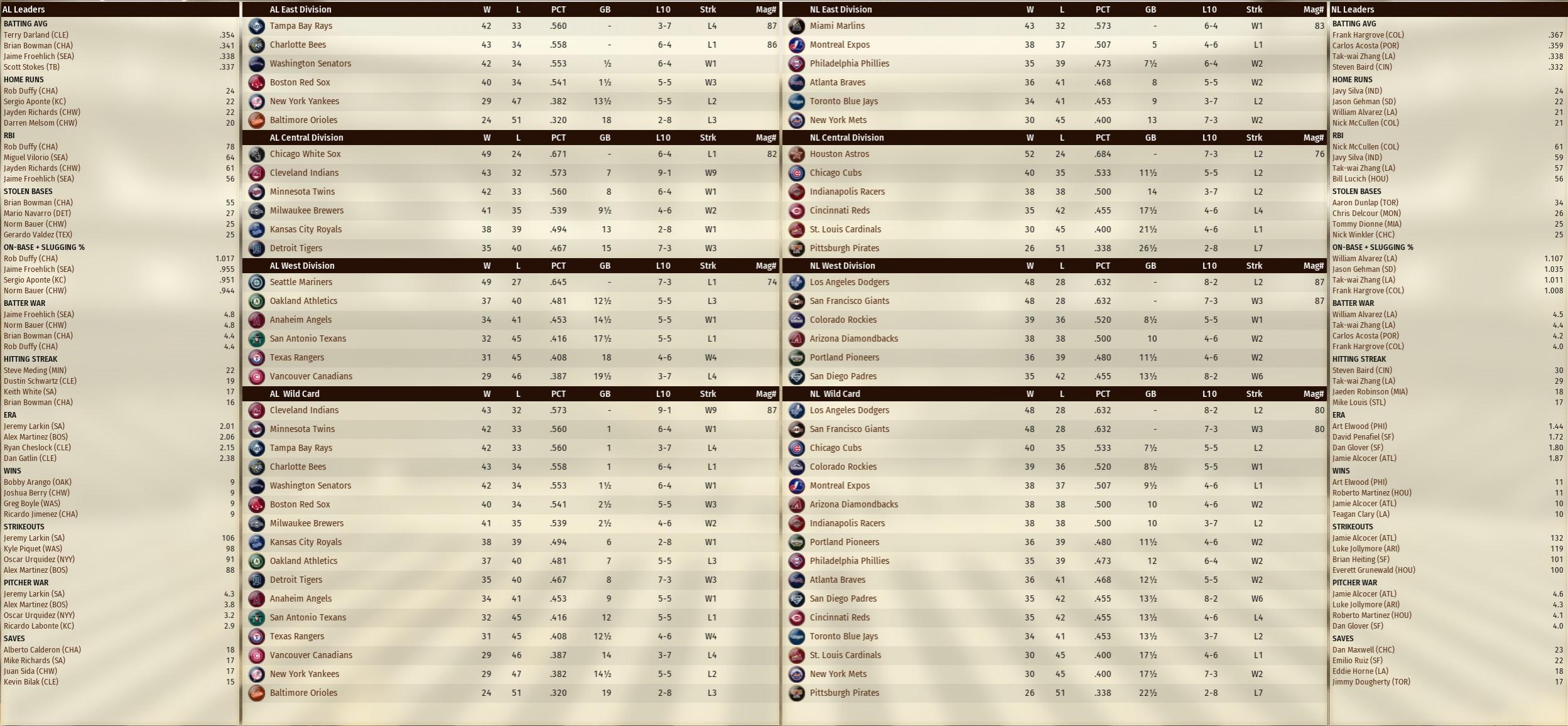 European Baseball League 2 subleagues with 8 teams/3 divisions each - we have 2 teams each from 24 European countries Central Baseball League 2 subleagues with 6 teams/3 divisions each - we have 6 teams each from Germany, France, Switzerland, Netherlands, Austria and England The league plays a 200-game schedule with best-of-nine play-offs World Baseball League 2 subleagues with 8 teams/4 divisions each - the World Association has teams from all over the world (from Auckland, NZL to Honolulu), the European Association obviously has teams from Europe. Just getting started: Fictional Major League Baseball The MLB set-up, but since I like to have divisions with an equal number of teams I moved the Brewers back to the AL and Houston back to the NL and added the Brooklyn Dodgers, Montreal Expos and Milwaukee Braves to the NL and the St. Louis Browns, Philadelphia A's and Washington Senators to the AL That adds inter-league rivalries in Philadelphia, St. Louis, Milwaukee, Washington.