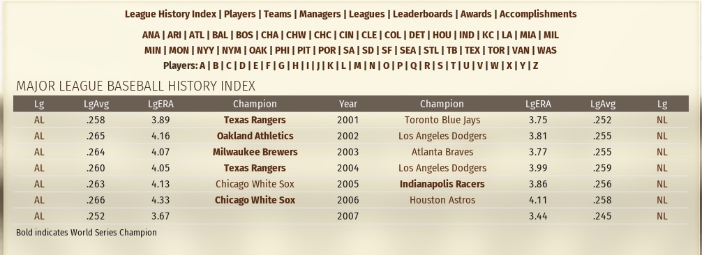 It's basically MLB 1973--two leagues, 2 divisions each, 6 teams each. One DH league/one not. Stats adjusted to 1980, money to 1990. No historical changes to stats, but inflation worked in. Started with year 2001 for easy tracking of how long league has been going. Simmed 25 seasons before taking over a team. Started adjusting names database to reflect world-appropriate first and last names. Now working on fully integrating my own nations (right now, there are just two "international" countries. |