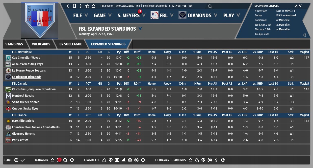 The FBL is composed of 3 divisions (all French speaking) that have four teams in Eastern Canada, France, and Martinique. The dialogue is generated from the point of view of a 16 year old Single A rookie (he is now 19 and in Double A) and takes place in 1960. His name is Julien Henri, born in Martinique.