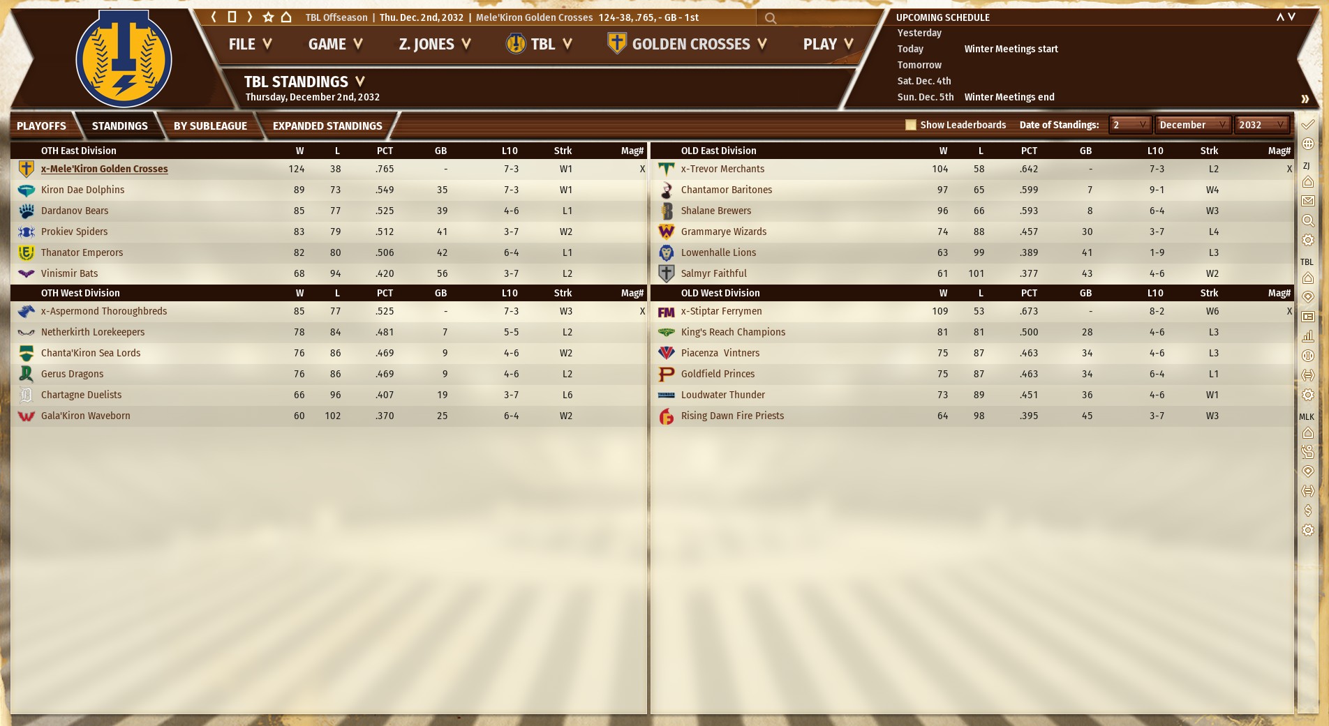 10 Teams each tier, 54 game schedule played on Fri-Sun Top 3 go to a playoff, Pennant winner gets a Bye. The playoff winner in each tier is promoted at the end of the season with the worst team getting relegated. It's fun way to play once you get the financials dialed in. |