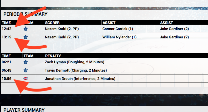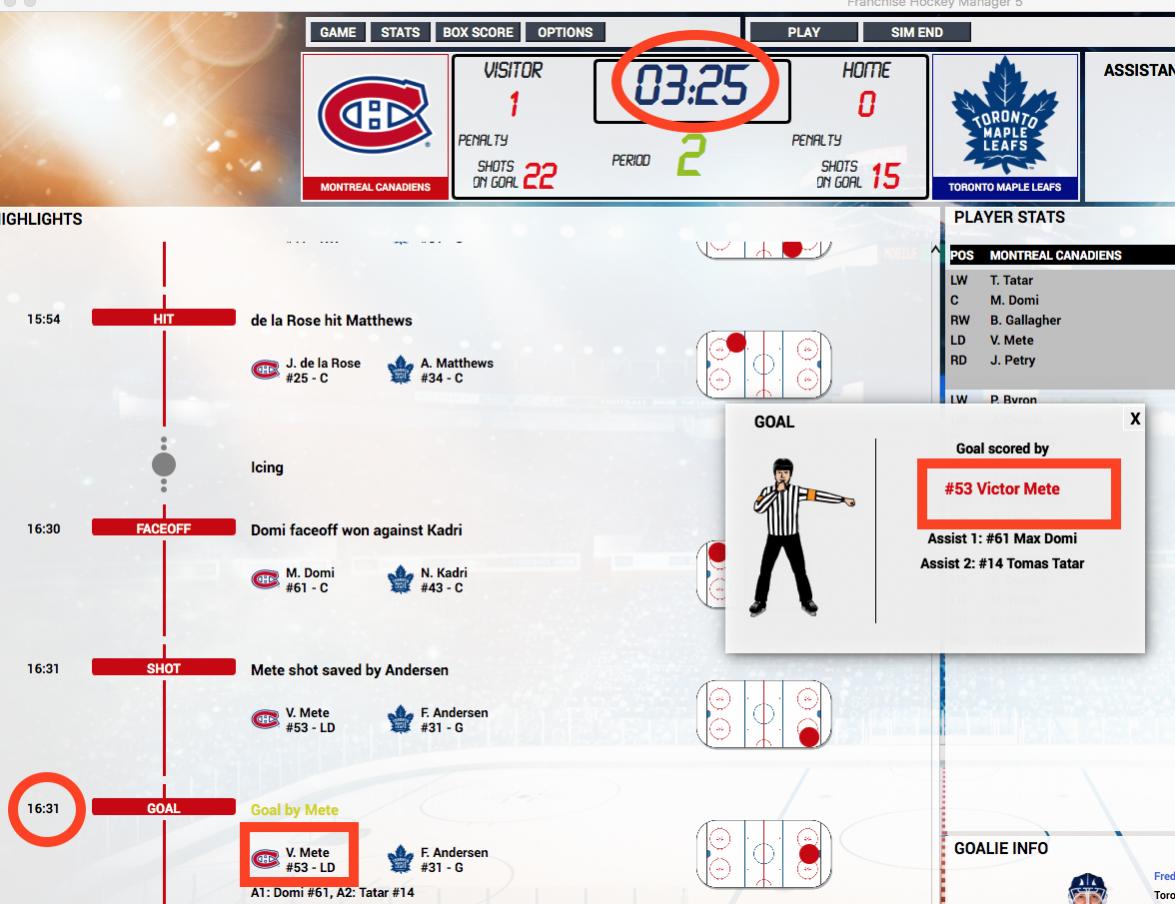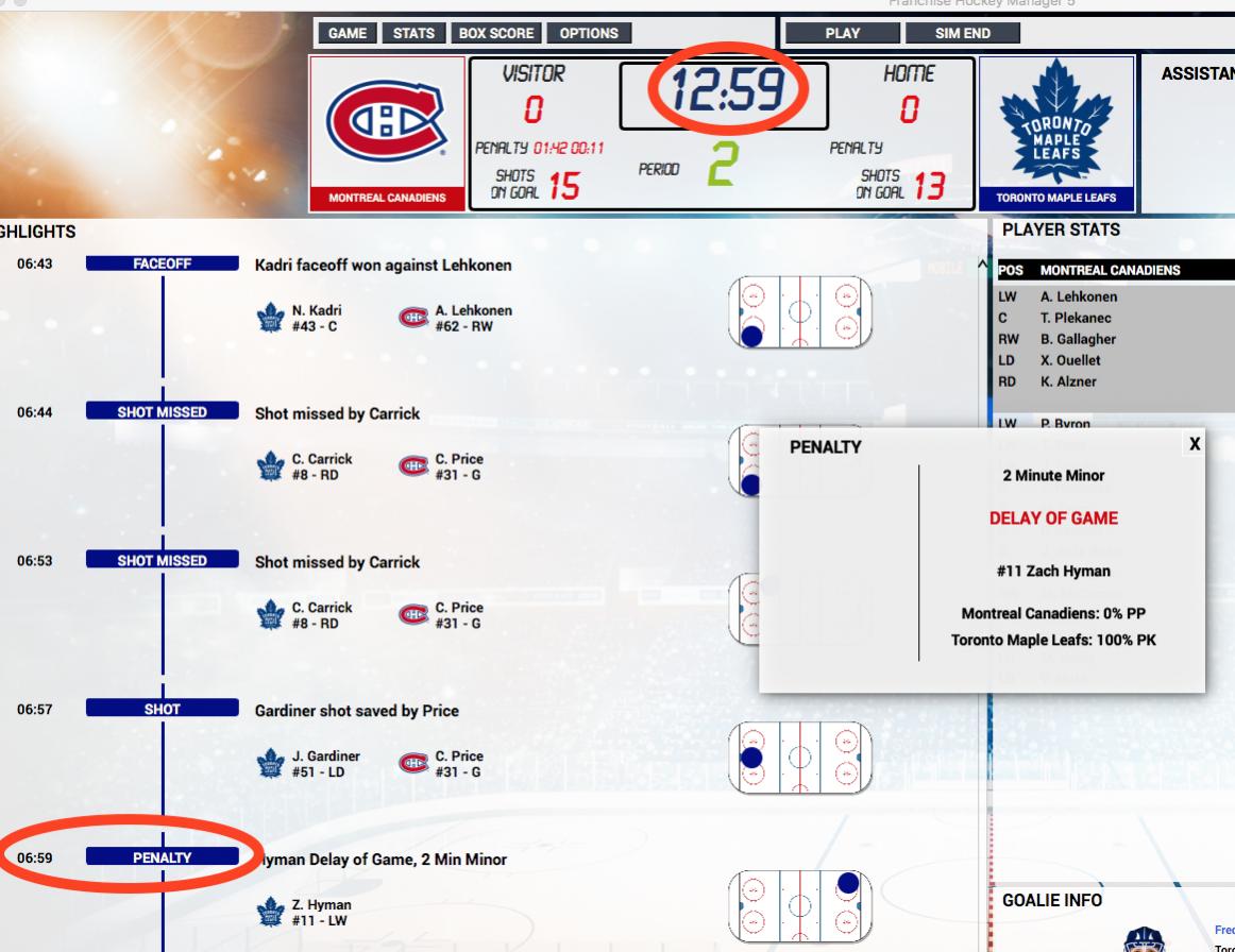 The time stamp for events, such as penalties and goals continues to be out of sync with respect to the game clock. The first screen shot below shows an example of this for a penalty that was called. The time clock indicates that 7:01 had elapsed, but the time stamp in the event list says 6:59. This happens for goals as well, as the second screen shot shows. Also notice that the goal announcement in the second screen shot does not indicate how many goals the goal scorer has scored so far this season. FHM4 provided that information, but this useful feature has disappeared in FHM5. I noticed an instance in which a goal was scored by one team (TOR) but was credited in the announcement box to the other team (MTL), as shown in the third screen shot below. It appears that this bug affected only the announcement box -- everything else updated as per the goal details listed in the event list. There seems to be a flaw in classifying goals as power play (PP) goals. In the fourth screen shot below, the second goal by TOR was scored at 13:19 and it was classified as a PP goal. But no one would have been in the penalty box at that time. There was an earlier PP goal by TOR scored about half a minute earlier (12:42), and that goal would have ended the penalty. And in any case, the penalty would have expired (at 12:56) by the time that second goal was scored, even if the first goal had not been scored. Also, in the box score available after the game, the second goal continued to be listed as a PP goal and the power play summary at the bottom of the box score falsely stated that there were 2 PP goals for TOR. There is a offset error in the active box score where player stats are shown. The home team's data are horizontally offset far to the right, whereas the visitor team's data are properly positioned. This is shown in the fifth screen shot below. This difference in offset appears in the box score only when the game is active. When viewing the box score after the game has ended by accessing it from the league schedule, both teams have their data offset to the right. The box score available while still in the game, but before leaving the game, does not display the shots on goal summary and power play goals summary at the bottom of the page as (I believe) it used to in FHM4. Only after leaving the game and going to the game report available on the schedule page do those summaries appear at the bottom of the displayed box score. When a team has a penalty, if that team's players are listed in the box to the right, the list of players currently on the ice (which appears with a gray highlight at the top of the list of players) continues to contain five players although only four of them are on the ice. The playing time increments for only four of them, but confusingly a fifth player is included in the set. In general, it would be great if a feature from FHM3 (I believe) were brought back where we had the option to have players currently on the ice listed for BOTH teams simultaneously. |