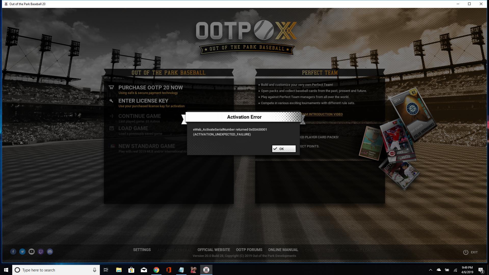I put in a ticket on this. I played OOTP XX, shut it down for a few hours, then loaded it back up and was asked for my license key. When I tried to enter the key, I got the following error.