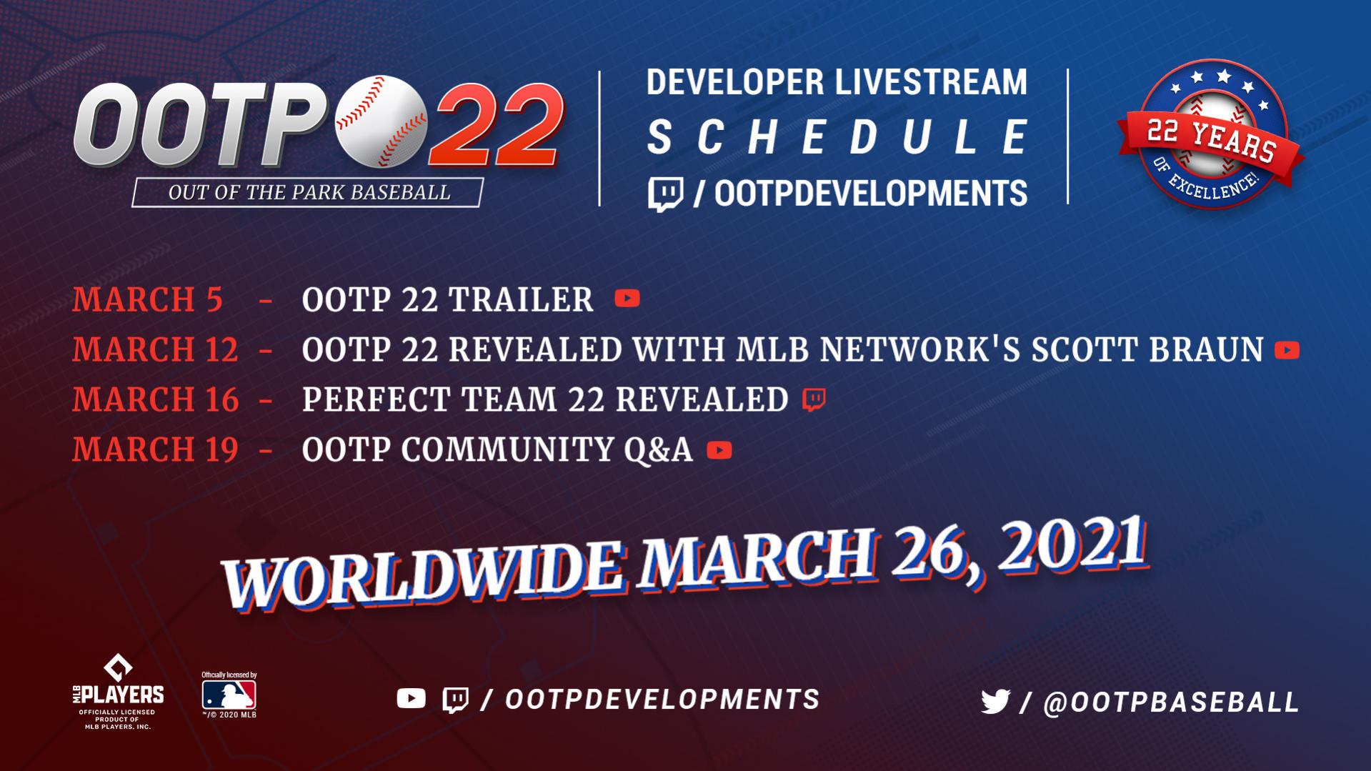 ![]() Hey everybody! It's the best time of the year again, Spring Training is approaching, the new MLB season is around the corner and a new OOTP version will be released soon. It's OOTP number 22 now, hard to believe but true, and March 26 is the official launch date! We have just started to accept pre-orders in our own webshop and launched a mini website with some additional information plus dates for our reveal shows where we will share more info about the new features and additions! You can pre-order Out of the Park Baseball 22 for $35.99 directly from our webshop, which nets you a 10% discount off the full retail price. When you pre-order, you will get early access to the final beta version of the game on March 23, 3 days before the official March 26 release date! Plus! Everyone who pre-orders or buys OOTP 22 during launch week gets a bonus Gold Pack in Perfect Team mode!* Info for Steam customers The game will launch on Steam on March 26 with a one-week 10% launch discount. There is no Steam preorder available. Please visit our Coming Soon page and add OOTP 22 to your wishlist! Reveal Show Info The all-new trailer for Out of the Park Baseball 22 will be unveiled Friday March 5th at 9 PM ET on our YouTube page. We have three live shows coming up dedicated to showing off EVERYTHING about Out of the Park Baseball 22. All the new features, upgrades, and modes will be presented in detail. Join us Friday March 12th at 3 PM ET on our YouTube page as MLB Network's Scott Braun hosts the OOTP 22 Reveal show! It will be a wonderful day of celebration and information as we go deeper into what OOTP 22 has for you. You will NOT want to miss it! Then, join us Tuesday March 16th at 9 PM ET on our Twitch channel as Perfect Team 22 is unveiled in full! See and hear about all the new features in our incredibly popular persistent online competitive mode. Sure to delight new and returning Perfect Team fans, this is a must-watch! Finally, join us Friday March 19th on our YouTube page for the Out of the Park Baseball 22 Community Q&A, where we will answer dozens of your questions about OOTP 22. It will be a night to remember! We can't wait to show the new OOTP to you. It will be epic! All the best & stay safe! Markus & the OOTP Team * - Users receive a free Gold Pack when creating a team in Perfect Team within 7 days after the official March 26 launch.