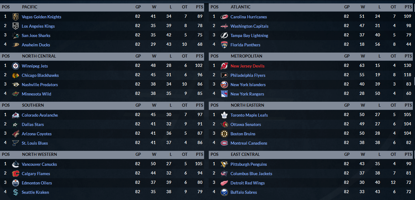 I checked the standings by the end of the regular season, the top two teams in the divisions are as follows: WEST 1 - VGK/LAK WEST 2 - WPG/CHI WEST 3 - COL/DAL WEST 4 - VAN/CGY EAST 1 - CAR/WSH EAST 2 - NJD/PHI EAST 3 - TOR/OTT EAST 4 - PIT/CLB Standings by conference were as follows: WEST - VAN/WPG/COL/CHI/CGY/DAL/VGK/ARZ EAST - NJD/PHI/CAR/TOR/OTT/BOS/WSH/PIT (meaning LAK and CLB should've been in with 2 teams from each div, replacing ARZ and BOS resp.) However, the playoff matchups are nothing like any of those: (overall position, league/conference, in parentheses) MIN (19/11w) at TOR (5/4e) BOS (7/6e) at OTT (6/5e) STL (17/9w) at PIT (14/8e) DET (28/13e) at CLB (22/11e) BUF (29/14e) at NJD (1/1e) NYI (20/9e) at PHI (2/2e) MTL (21/10e) at CAR (3/3e) TBL (25/12e) at WSH (9/7e) 14 out of 16 playoff teams are from EAS, the top 14 from EAS that is, only the bottom 2 are out (NYR/FLA), but the 2 WES teams finished 9th and 11th in their conference. Does anyone know why, or what I can do to get it right next season? Or do I have to revert to 2 divisions per conference to get it right? |