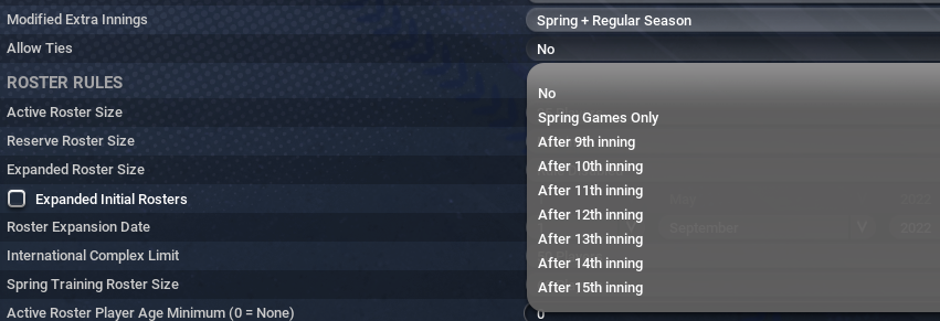 I am definitely one of the few who like the extra inning rule and I am really glad its a option again but could the option be added to have it not start in the 10th inning like with ties which has options up to the 15th inning?