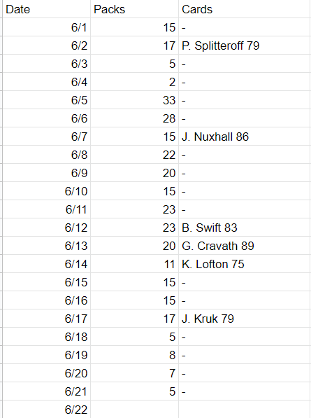 I started recording my packs/card rewards every day in June and it helps to see that the packs really are coming in overall, despite the slumps.