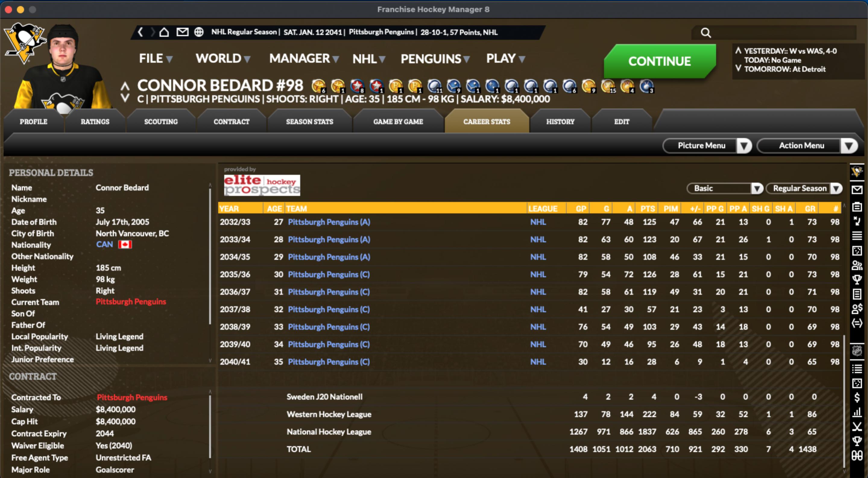 I'm trying to win the cup every year so might not have the best wingers to play with Bedard. He won the Stanley cup 15 times out of 17 possible. In all of my saves players who are averaging 2 points a game early on seem to go on a wicked cold streak later in the year. 130 points in a season is the most I've ever seen... |