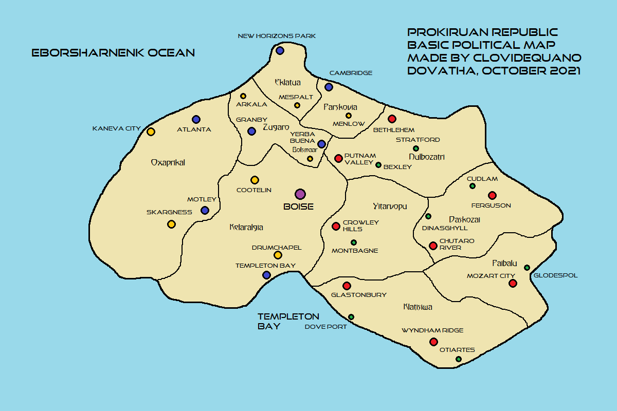 I would like at least one or two primarily terrain-based maps for my fictional nation of Prokiru essentially based on the map shown below and the information in the attached text file, please, if possible. For the places listed in the file that are not shown on the posted map, please feel free to locate them wherever you wish, folks.