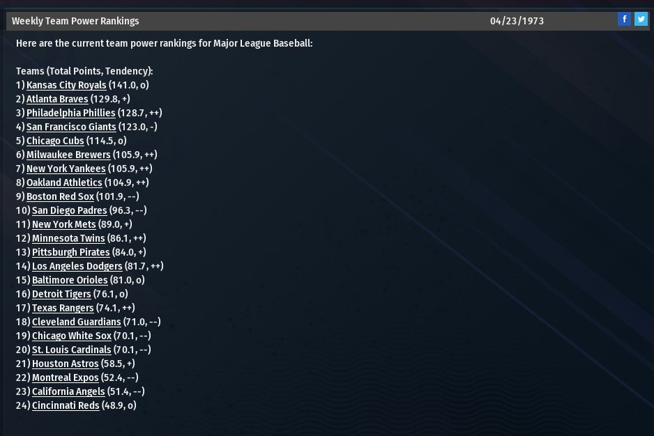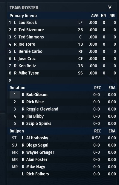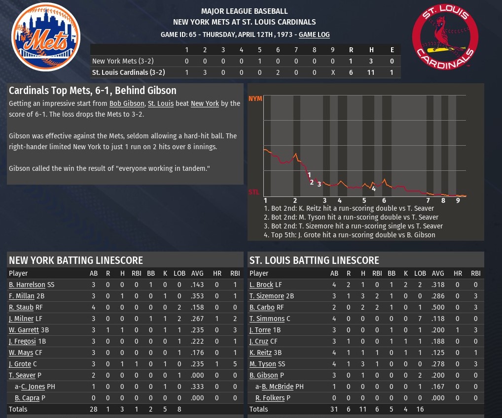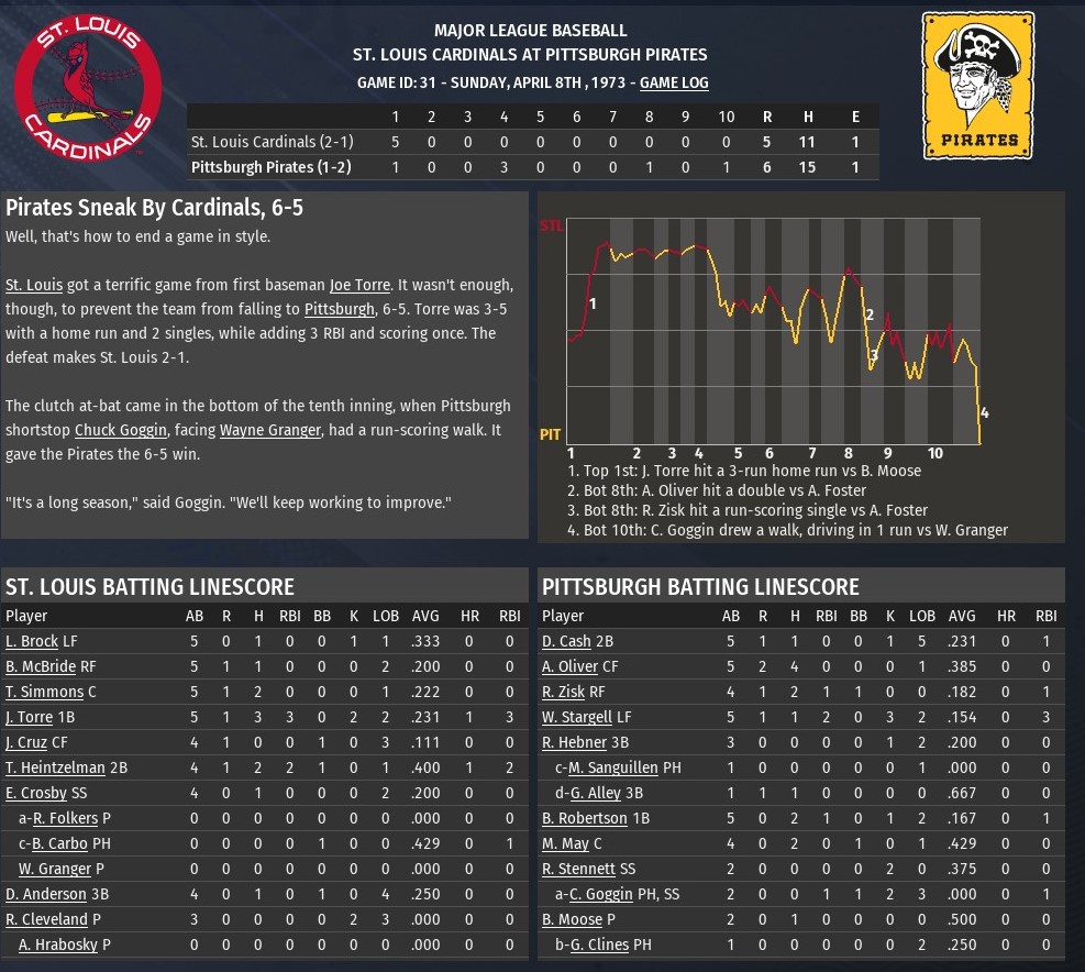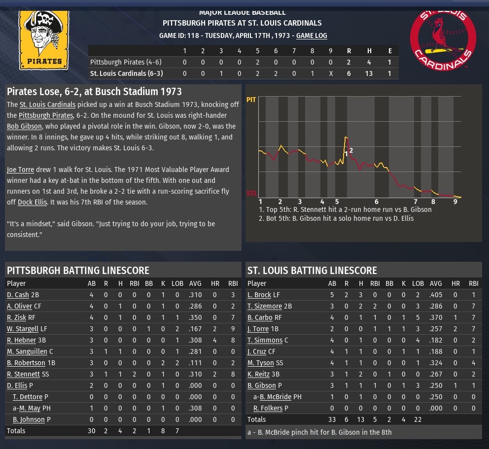With the ending of my St. Louis River Walkers franchise after 24 seasons, 2018 through 2042, I decided to take on something different. My first baseball memory is watching the 1971 World Series -- the Pittsburgh Pirates defeated the Baltimore Orioles in a thrilling seven games. Steve Blass was the hero on the mound for the Bucs. The immortal Roberto Clemente was the MVP. The first pennant race I remember being invested in was in 1973, when my team, the St. Louis Cardinals, battled the New York Mets and Pittsburgh Pirates down to the wire. Despite going 81-81, the Cardinals were not eliminated until Sept. 28 with two games remaining. The Mets won the division with an 82-79 record. They would go on to defeat the heavily favored Cincinnati Reds, who had gone 99-63, in the National League Championship Series. Defending World Series champion Oakland would defeat the Mets in a thrilling seven-game series, claiming the second of three consecutive championships. This St. Louis team features an aging Bob Gibson as its ace and Lou Brock at the top of its lineup. Joe Torre is two-years past an MVP campaign in 1971, while Ted Simmons is his second season as a starter in what will become a Hall -of-Fame career. The rules of the game are the same. No DH, no interleague play, etc. But this is my team and I will not be bound by history in terms of lineups, the ability to make trades or move players up and down from the minors. However, I can only trade/release players on or after the date they were traded during the 1973 season. That doesn't mean, I have to make the same exact transaction that was made according to history. I can trade them to a different team at a different time, or combine them with another player who is eligible to be moved based upon the parameters I plan to follow. I have already played through spring training and the season will commence on opening day. Last edited by rink23; 10-11-2022 at 03:08 AM. |