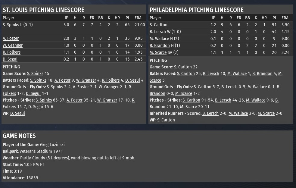 Cards 73: April 22 -- Philadelphia 5, St. Louis 0, Game 2