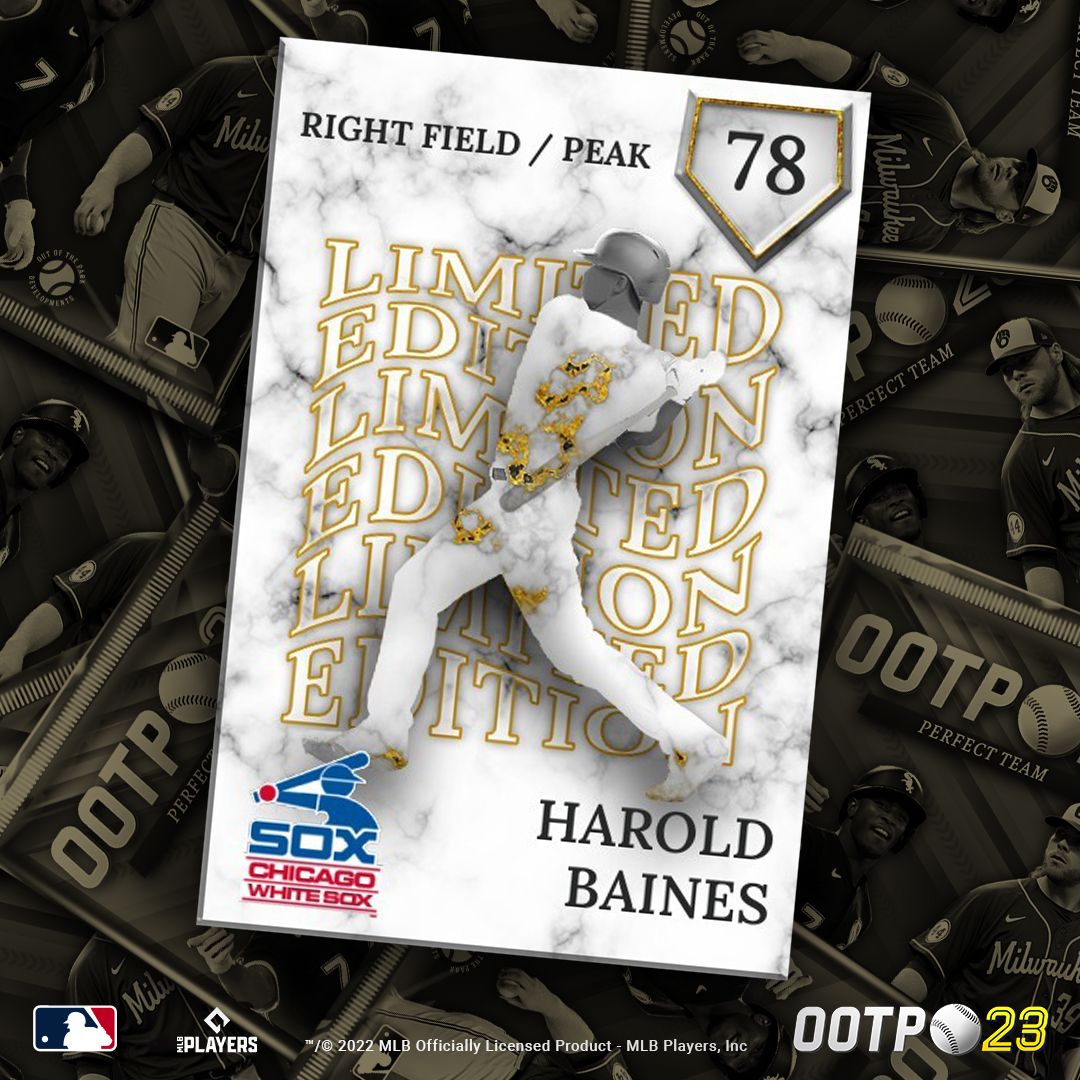 --------------------------------------------------------------------------------------------------- A Hall-of-Fame hitter from the 80s and 90s is now available as a 100-copy Limited Edition Card! In his career with Chicago, Baltimore, Oakland, Texas and Cleveland, Harold Baines hit .289/.356/.465 with 384 career homers! Harold Baines is IN Perfect Team 23!
