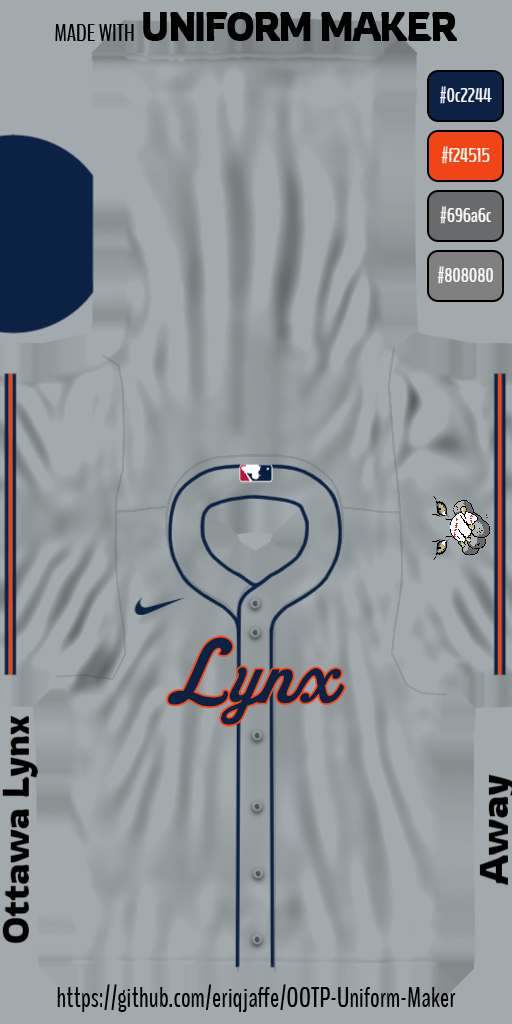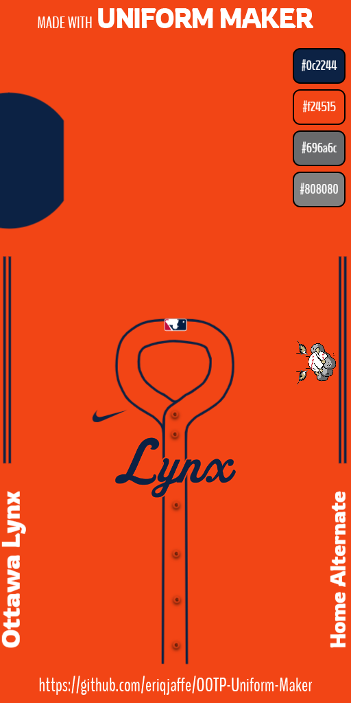 ![]() Awesome job with it. Just one suggestion - perhaps the MLB logo should be removed since Ottawa Lynx never played in the big leagues. I will definitely be adding this team to my farm system. |