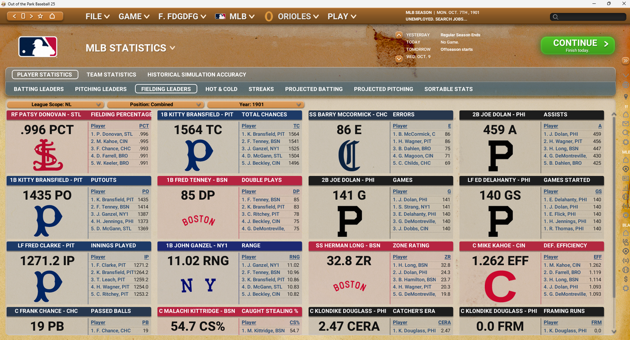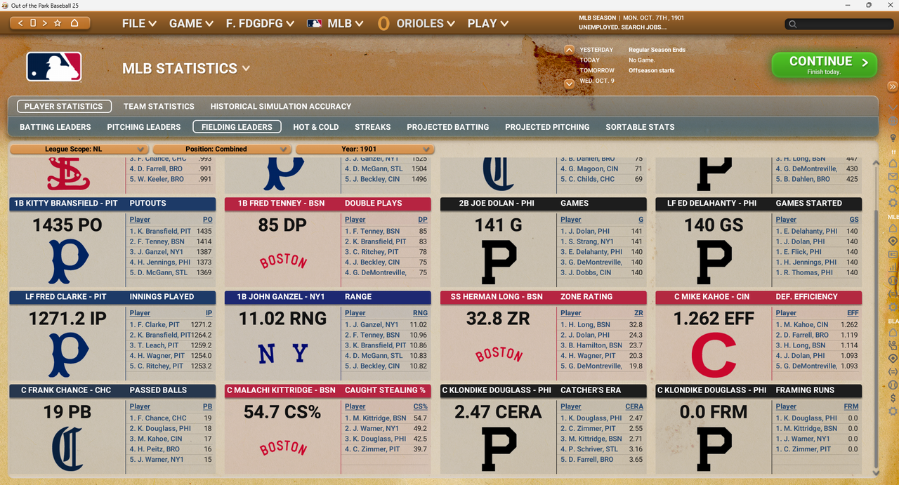 The Orioles still have a 3-game lead ahead of the Americans and White Stockings (I'm calling them the White Stockings because this was their official name until 1904). Baltimore had the best month of August, going 19-12 and racking up 3 saves (which were not officially counted until 1969). Nap Lajoie is still being Nap Lajoie, leading in batting average, slugging, OPS, and hits, but Buck Freeman is trailing in batting average and leading in homers and RBI. An interesting thing to note is that Freeman had the best batting average among all qualified AL hitters in August, hitting .380, while Nap hit just .357. Nixey still leads in ERA (1.83), Cy still leads in wins (20), and Ned still leads in strikeouts (90). Case Patten is the only pitcher in the AL to have 20 or more losses, sitting at 21. Cy is striking out 3 batters for every walk he allows, still leading the AL. NATIONAL LEAGUE Although the Cardinals are still ahead in the NL standings, they're just 5 games ahead now, as the Pirates won 18 of 22 in the month of August, while St. Louis only won 16 of 27. The Phillies, though, won 21 of 29, having the best month in all of MLB. As for the New York Giants, a pennant is easily out of the equation, following a 5-23 month. Sam Crawford is making a name of himself, leading the NL in homers, slugging, and OPS. Jesse Burkett leads in batting average and OBP, and his teammate Emmet Heidrick leads in RBI. One thing I haven't talked about much is stolen bases, which is being led by Topsy Hartsel, with his teammate Frank Chance right behind him. Jesse Tannehill still has the best ERA (1.72), Jack Powell still has the most wins (20, only NL pitcher), and Tom Hughes still has the most strikeouts (194). Tannehill is striking people out at a better K/BB rate than most. He has only allowed 16 walks, striking out almost 8 people per walk. In fact, in his last 4 appearances of August, all for 8+ innings, he only allowed a single walk, and struck out 17 in that span. That's good for 1901. The best of August to follow. -------------------------------------------------------------------------------------------------