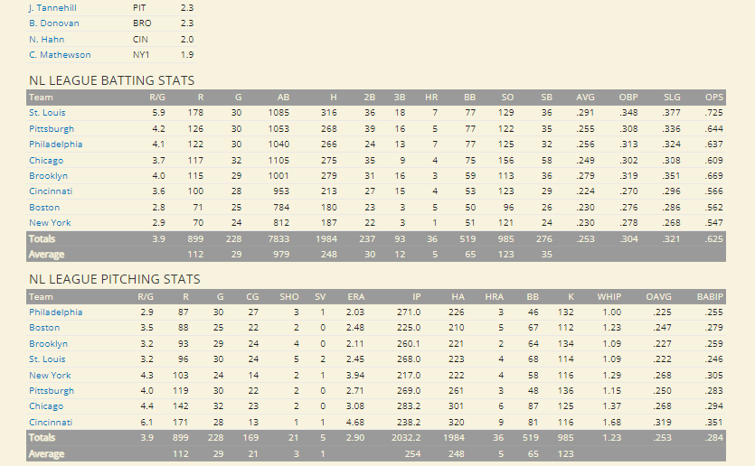 The Orioles lead the AL by a game and a half. The White Stockings are still in the mix, 3 games back. Everyone else is way back. Nap Lajoie still has the best AL batting average, at .430 (the only .400+ batting average). He also leads with 9 home runs, but Buck Freeman leads in RBIs with 75, 8 ahead of 2nd place. Lajoie's war, slugging percentage, and OPS also lead the AL. While Nixey Callahan still has the only under-2 ERA in the AL, at 1.81, Cy Young leads in wins with 15, and the Brewers' Ned Garvin leads in the last Triple Crown category: strikeouts, with 69. Case Patten of the Senators has the most losses, with 15. Young has almost 3 strikeouts per walk, which also leads the AL. NATIONAL LEAGUE The Cardinals still have a big lead in the NL, by 8 and a half. The Phillies and Pirates, at this point, are only battling for 2nd. Jesse Burkett has a .375 AVG, a .452 OBP, and a .502 SLG, dominating the other 7 teams. Sam Crawford is also in uncharted territory, having hit 16 home runs. Emmet Heidrick has 78 RBIs. Jesse Tannehill has the best ERA in the National, at 1.88. Jack Powell of the Cardinals has collected 16 wins, and Tom Hughes has 152 strikeouts, way more than the AL leader. Tannehill has 7.5 K/BB, 4 more than second place Jack Powell. Moments + Awards is soon to come. -------------------------------------------------------------------------------------------------