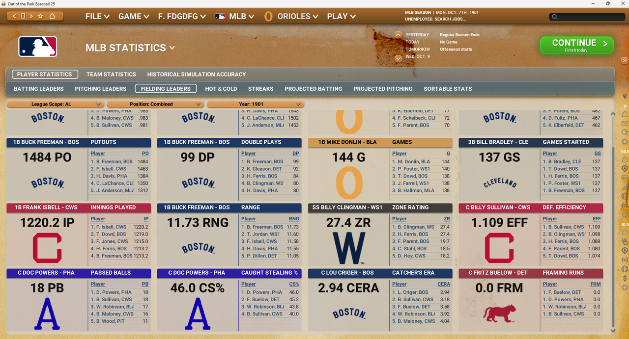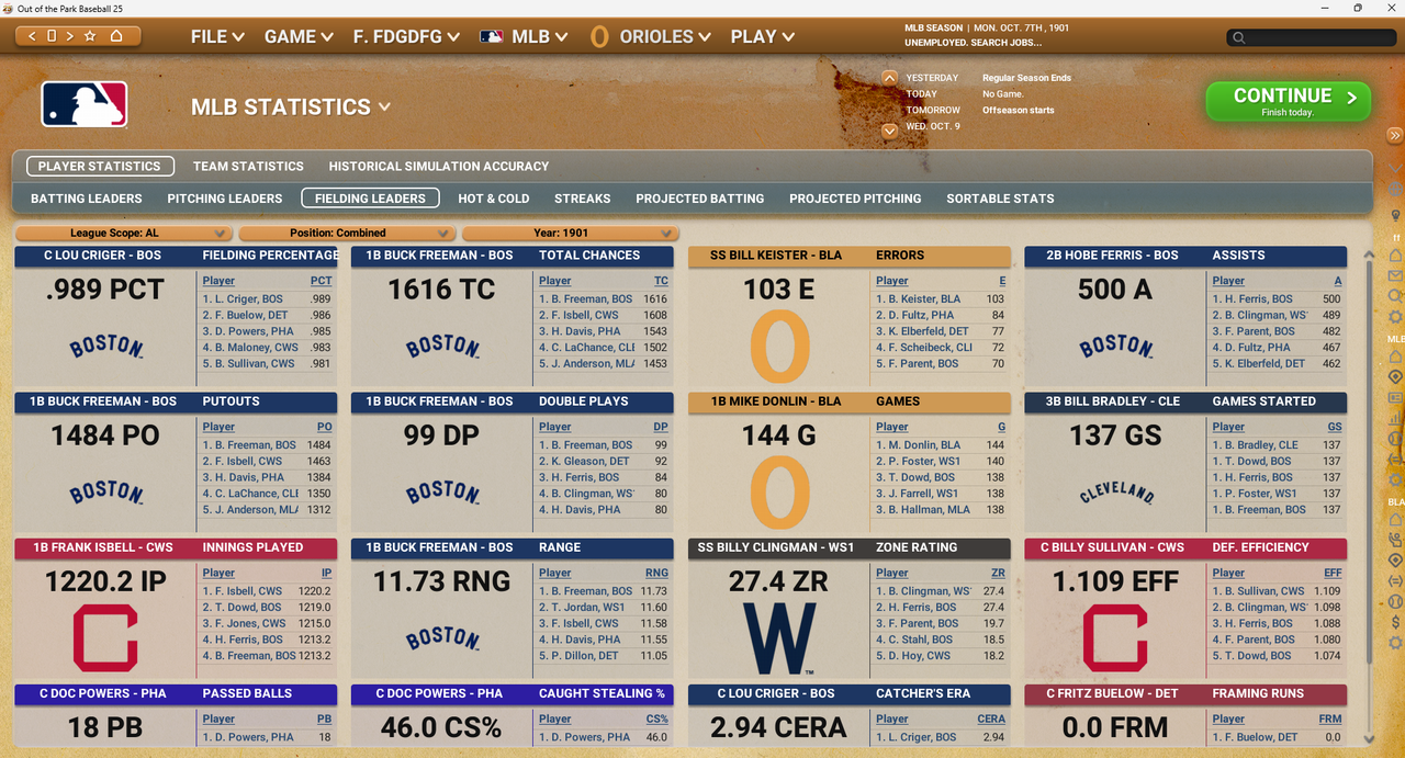 AMERICAN LEAGUE The Orioles were unable to continue winning, giving way to both the Stockings and the Americans. On September 26th, with a Chicago win over the Americans, they ended up clinching the American League pennant. Baltimore finished 7 games back, and everyone else was at least 15 games back. Nap Lajoie continued his great hitting, ending the season with a .409 batting average. He and Buck Freeman had the only OPS north of 1 (1.062 for Nap, 1.016 for Buck). Nap also had a WAR of 7.4, which was only behind the 9.1 of Jimmy Collins. Buck Freeman tied with Nap on HRs (14) and beat him by 12 on RBIs (125; Nap had 113 and was tied for 3rd). Ollie Pickering of the Blues stole the most bags, 52. Nixey Callahan had the best ERA in the league, at 1.93. Cy Young finished with 25 wins, and Case Patten, who also had the most losses in the AL (25), struck out the most batters (119). Cy Young struck out 3.4 batters per walk, well ahead of the rest of the AL. Bill Keister of the Orioles had the most errors among all AL players, the only one with 100 or more. He committed 103 errors. NATIONAL LEAGUE St. Louis will also not see a pennant winner, as the Cards struggled in September. Despite a 7-game season-ending winning streak, it wasn't enough to save the season. This paved the way for the Phillies and Pirates to fight for the NL pennant. In the end, however, it was won by the Phillies, who clinched on October 2nd over the Pittsburgh Pirates. Jesse Burkett was the batting champion of the NL, hitting .354. Sam Crawford hit an outstanding 25 homers. Emmet Heidrick drove in 114. All of them led the NL. Honus Wagner stole 49 bags. And Roy Thomas was the only player in either league to draw 100 or more walks, drawing 102. Pitching in the NL was dominated by Jesse Tannehill, who had the best ERA at 1.8, ahead of his teammate Sam Leever (who also had a 1.88 ERA). Deacon Phillippe had 25 wins, and Tom Hughes struck out 237, a lot more than the AL leader. Tannehill struck out 7.2 per walk, well ahead of the rest. Patsy Donovan was the best fielder in the NL, with a .996 fielding percentage. Barry McCormick and Honus Wagner committed the most errors. I will show the AL standings and stats first, then the NL, then the Memorable Moments of September/October.