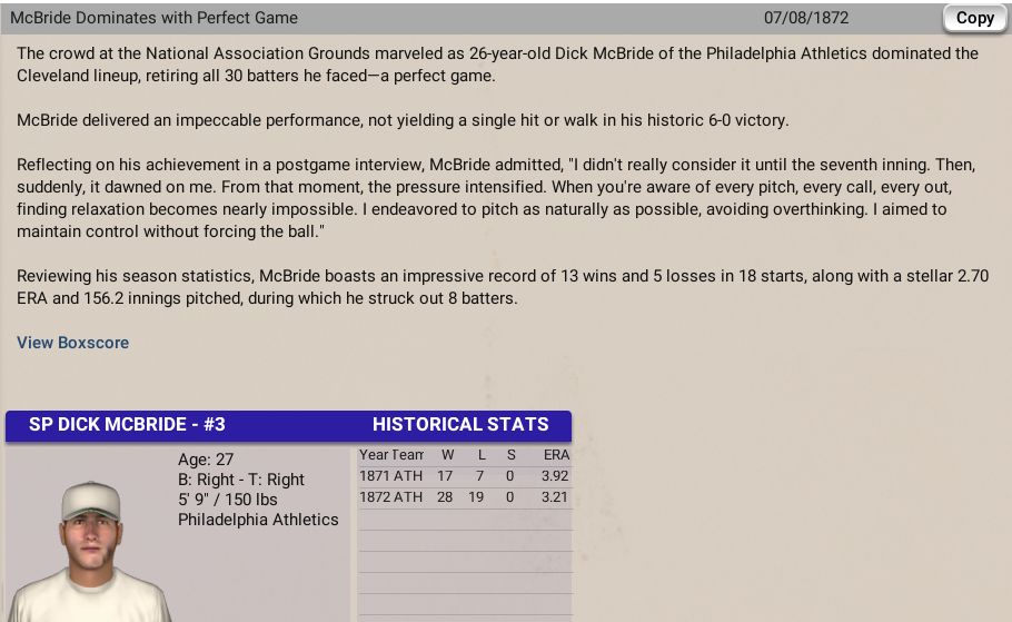 After just five seasons, the National Association has ceased operations. It is evident that a significant factor contributing to its demise was the lack of stability. Over the course of five seasons, the league fluctuated between 26 and 25 different franchises, with discrepancies arising over whether to include the 1871 Chicago team as part of the continuity with the 1874 Chicago team. This instability was further exacerbated by numerous teams folding mid-season every season. In response to these challenges, efforts are underway during the off-season to establish a new league comprised of a select number of teams. The hope is that this new venture will rectify the issues that plagued the National Association. Thus, the year 1876 will mark the inception of the National League. It is noteworthy that, in a nod to historical accuracy, the starting pitchers designated by the game will align with those of real-life counterparts with no interference from me.