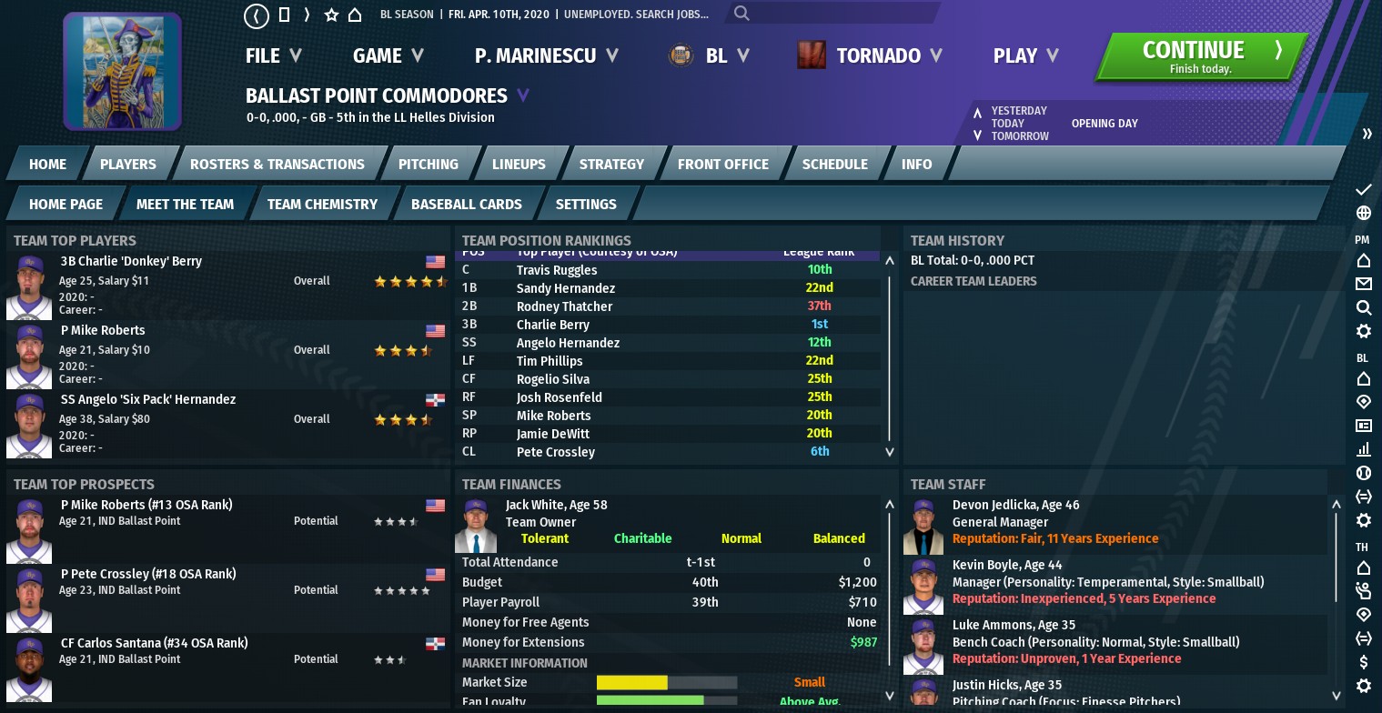 Ballast Point Commodores C - Travis Ruggles (4th round - 140th overall) 1B- Sandy Hernandez (8th round - 300th overall) 2B- Rodney Thatcher (20th round - 780th overall) 3B- Charlie Berry (1st round - 21st overall) SS- Angelo Hernandez (5th round - 181st overall) LF- Tim Phillips (14th round - 540th overall) CF- Rogelio Silva (15th round - 581st overall) RF- Josh Rosenfeld (7th round - 261st overall) top SP - Mike Roberts (2nd round - 60th overall) top RP - Jamie Dewitt (16th round - 620th overall) CL - Pete Crossley (3rd round - 101st overall) top prospect - SP - Mike Roberts |