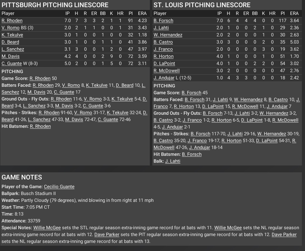 I played a 28 inning game with my 1985 (started in '82) Cardinals. 8 hours and 13 minutes 196 at bats I stole 7 bases - caught off 4 times No runs scored between the 9th and the 27th I usually run a normal 10-man staff from the 80s, but have 11 because of Rule 5 selection Roger McDowell. I used 9 of the 11, including my next 2 starting pitchers in the rotation - Dave LaPoint and Joaquin Andujar. Following the game, to keep fresh arms on the staff, I optioned 3 relievers (who had options), and called up 2 relievers to have fresh arms in the pen, and then bounced 2 starters up and down over the next to 2 games to cover LaPoint and Andujar's starts. 19 shutout innings for the Pirates bullpen - 20 for my bullpen. The logistical challenges games like these present are part of the fun. |