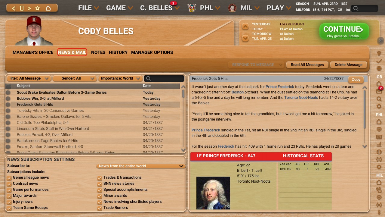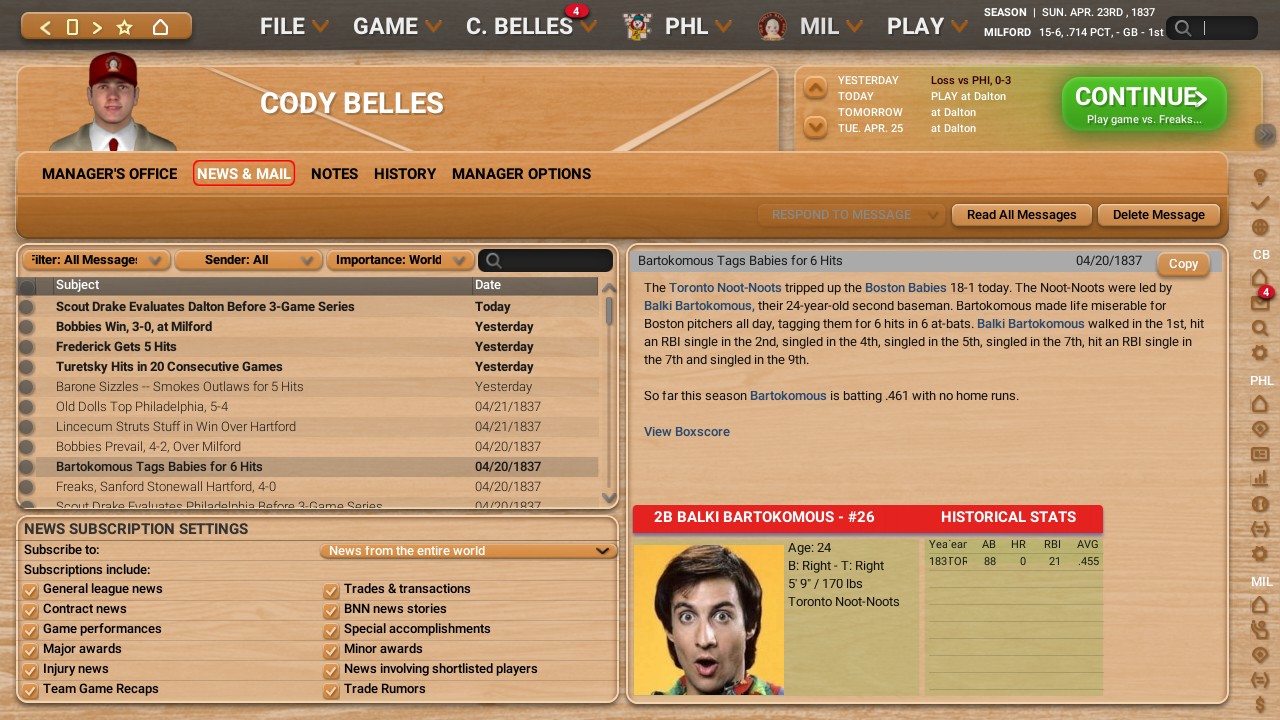 With the Noot-Noots offense going nuts lately, it is worth mentioning that center fielder Ross Turetsky also has a nice 20-game hitting streak going on. It seems like this team is quickly becoming a threat around the league. More news: Fred Sanford of the Dalton Freaks apparently started a brawl after mouthing off at the Hartford Dancing Mice but it would appear no one received any kind of suspensions or anything for it. And here is some more news and headlines: