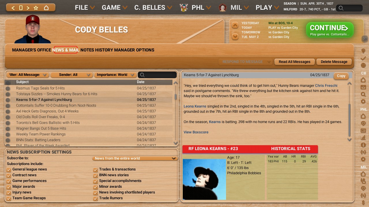 Here is some more news from throughout the league. Also the Philadelphia Bobbies have finally lost a game, but that doesn't seem to be a big deal as they are currently 11-1 and still sitting in first place in the Goliath League. The Boston Babies are really struggling as they not only sit in last place in the Goliath League, but have the most losses and least wins of every team in the entire Playhouse League (2-10). After sweeping Worcester, the Dolls have jumped up to first place in the David League, taking the spot from their small town Pennsylvania home state rival, the Dalton Freaks, who were briefly holding it for a few days now. We have tomorrow off but a series against the Lynchburg Hunny Bears the next day.