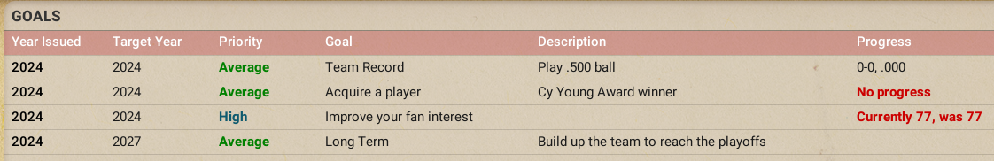 As mentioned above, I received three (3) goals from Boston Red Sox team owner John Henry. Two of the goals ("play .500 ball" and "improve your fan interest") have a target completion date of this season and seem doable. I also have the goal of acquiring a "Cy Young Award" winner this year which might prove to be a difficult challenge. The remaining goal has a target completion date of 2027 in which I need to "build up the team to reach the playoffs."