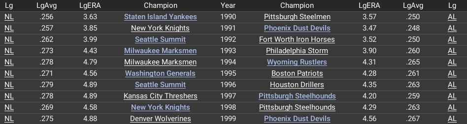 2000 Season Pre-season I've taken charge of the Tucson Scorpions of the American Baseball League. The leagues first decade has just finished. Here is the league alignment. Tucson entered the league with New Orleans after the original 1990 season. The Jacksonville Tropic were originally the Utah Mammoth but relocated in 1996. I'll be bringing the Mammoth back as an expansion franchise at some point as I love the name! Here is a brief synopsis of the league's awards. Take a gander at one Tyler Higginbotham. That's right, 5 straight MVPs! In case you're wondering he rejected the Aces qualifying offer, became a free agent and signed a then record 4 year 22.6m dollar deal with the New York Knights. He would go on to win 4 more MVPs in the 4 years of that deal. 3 Player of the month awards, 5 MVPs, 1 Gold Glove, 6 Silver Sluggers, a post season MVP award and 7 all-star selections. His career is winding down in Philadelphia now but I am ok saying he's likely the 1st member of the ABL HOF. Did I mention he was the 1st overall pick in the original ABL draft? Here's a peek at the season/career leaders offensively and defensively. The Scorpions are one of two franchises that has never made the post-season (LA is the other). They are coming off a strong '99 season. I've made a ton of deals and I'll try to cover the roster composition and organization setup prior to starting (but I do want to start playing)!. As I did before, I will play every single game, defense only. I like to manage the staff and pitching but want the game engine to handle the offense. I am in GM mode with “unable to be fired” for now. All my minor leagues are run by me, for now. I did nothing to the personnel in the big leagues as I felt like I wanted to let the game play out and then I will address the gaps where I think they exist, same with the minor league coaches. I do have the games #1 prospect and the league's top-rated farm system. Pat was the #1 overall pick in last years draft out of Columbus College (JUCO). If you know me, you know I am all about pitching, and as such, I spent the winter wheeling and dealing for young arms and, most importantly, draft picks. In this year's draft, I've managed to acquire 3 1st round picks (17, 19, and 26) as well as the following: 2nd Round 40 and 42 3rd Round 69 Those picks were acquired through trades of talent and draft picks. I have no 4th-, 5th-, or 6th-round selections.