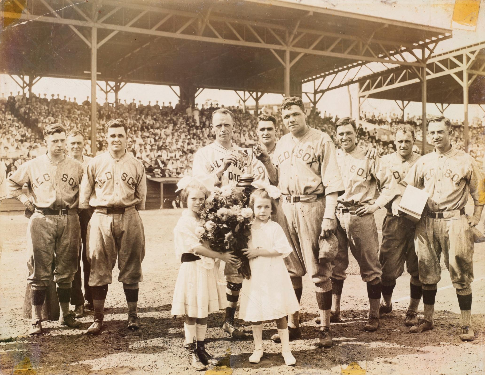 From twitter user Tom Shieber.. From1919 Exhibition game between Baltimore Dry Docks and Boston Red Sox. L to R: Frank Gilhooly, Lefty Shields (Public Announcer), Stuffy McInnis, Sam Frock (Dry Docks Mgr.), Norm McNeil, Babe Ruth, Ossie Vitt, Wally Schang, Everett Scott. Nice upgrades for Boston players Gilhooly and McNeil.https://tinyurl.com/ts-wdcr
