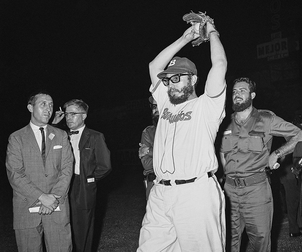 Fidel did throw hard, by all accounts, but was wild. He was never a prospect, no one scouted him, tales of bonus money offered are ridiculous since the organization allegedly making the offer (the Senators) were cheap as hell. And Fidel never wanted a baseball career anyway. He was a spoiled rich kid who was going to become a lawyer and make money. Baseball didn't pay the kind of salary to compete with that. Anyway, the B&W for this image was on something called "scoopfest", which is sort of like Pinterest. I obliterated the other people in the shot on purpose (they served no function). This is from the 1959 exhibition where Fidel's team was Los Barbudos, which means "The Bearded Ones". |