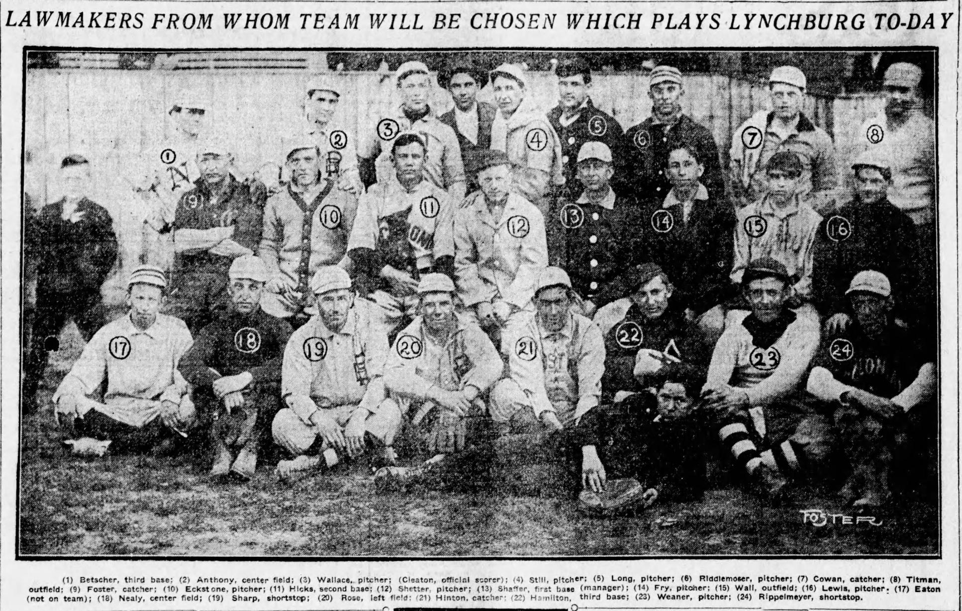 The photo below comes from the Richmond Times of March 14, 1906. In comparing this with the Frederick team photo above, it's my opinion that Riddlemoser is the sixth player from the left in the team photo. Anyone have any different thoughts?